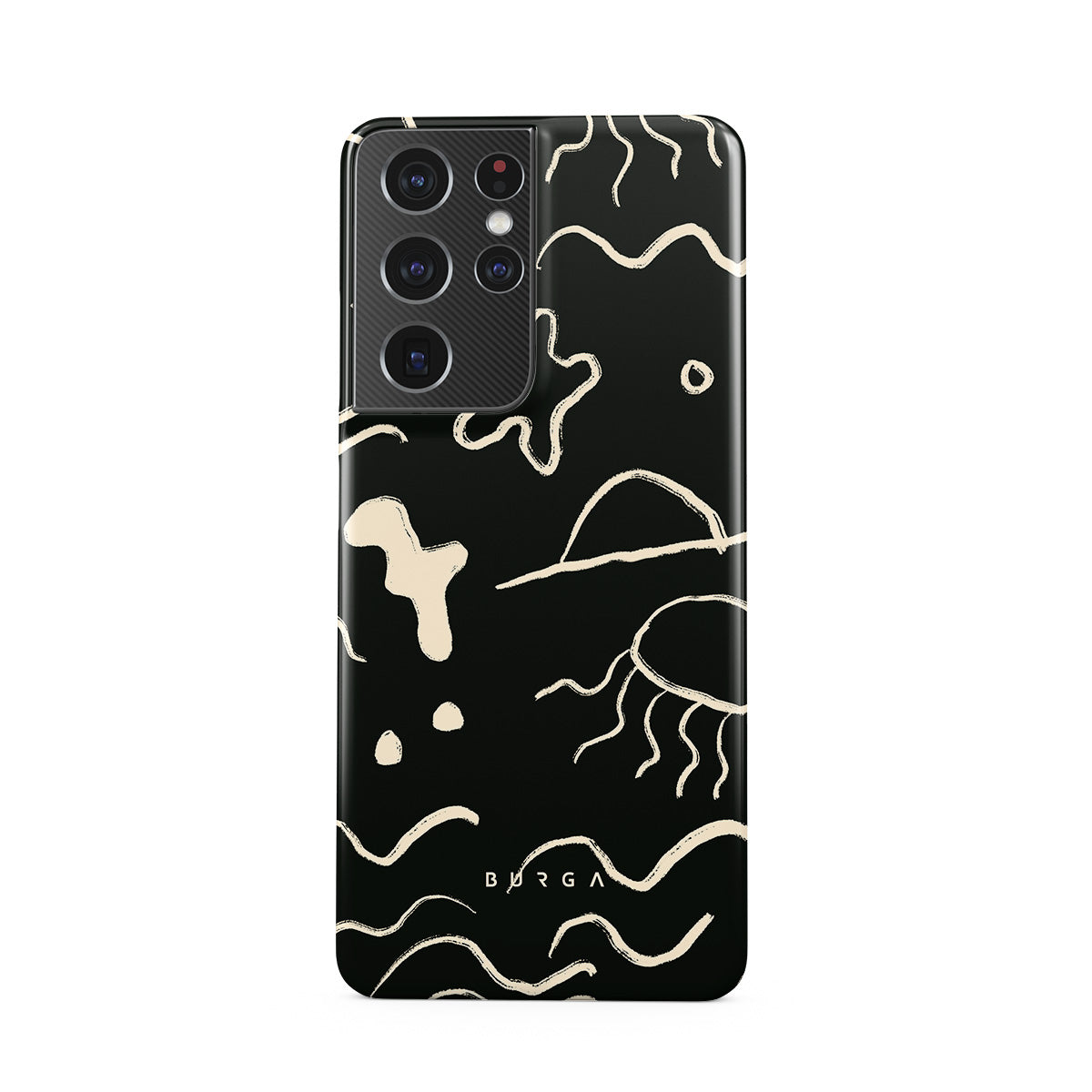 Our Eclipse Samsung Galaxy S21 Ultra design reflects the enigmatic beauty of the ocean during a solar eclipse. The dark hues and bright accents represent how the light dances on the water, while the waves and jellyfish capture the serene yet dynamic nature of the ocean.