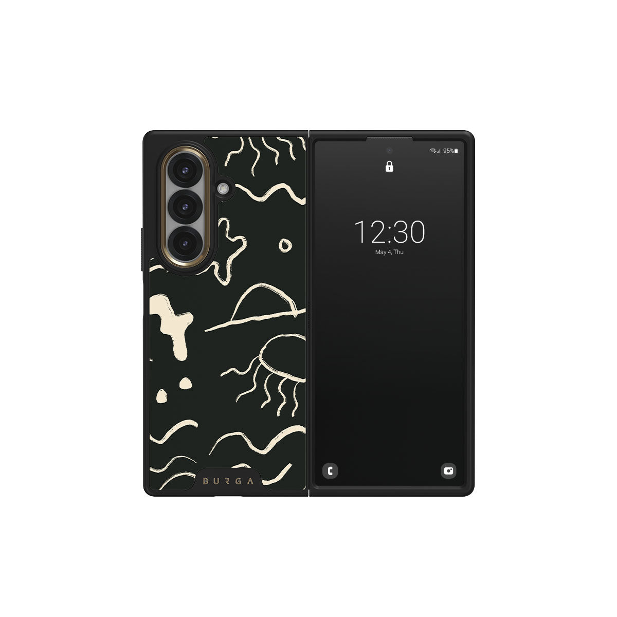 Our Eclipse Samsung Galaxy Z Fold 7 design reflects the enigmatic beauty of the ocean during a solar eclipse. The dark hues and bright accents represent how the light dances on the water, while the waves and jellyfish capture the serene yet dynamic nature of the ocean.
