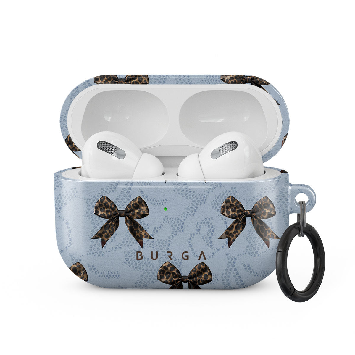 For those who command attention with subtle elegance, our Fashionista AirPods Pro case cover design is your go-to. A soft blue background, accented by dark grey bows and subtle lace patterns, exudes polished, effortless style. It's quiet confidence with a hint of charm.