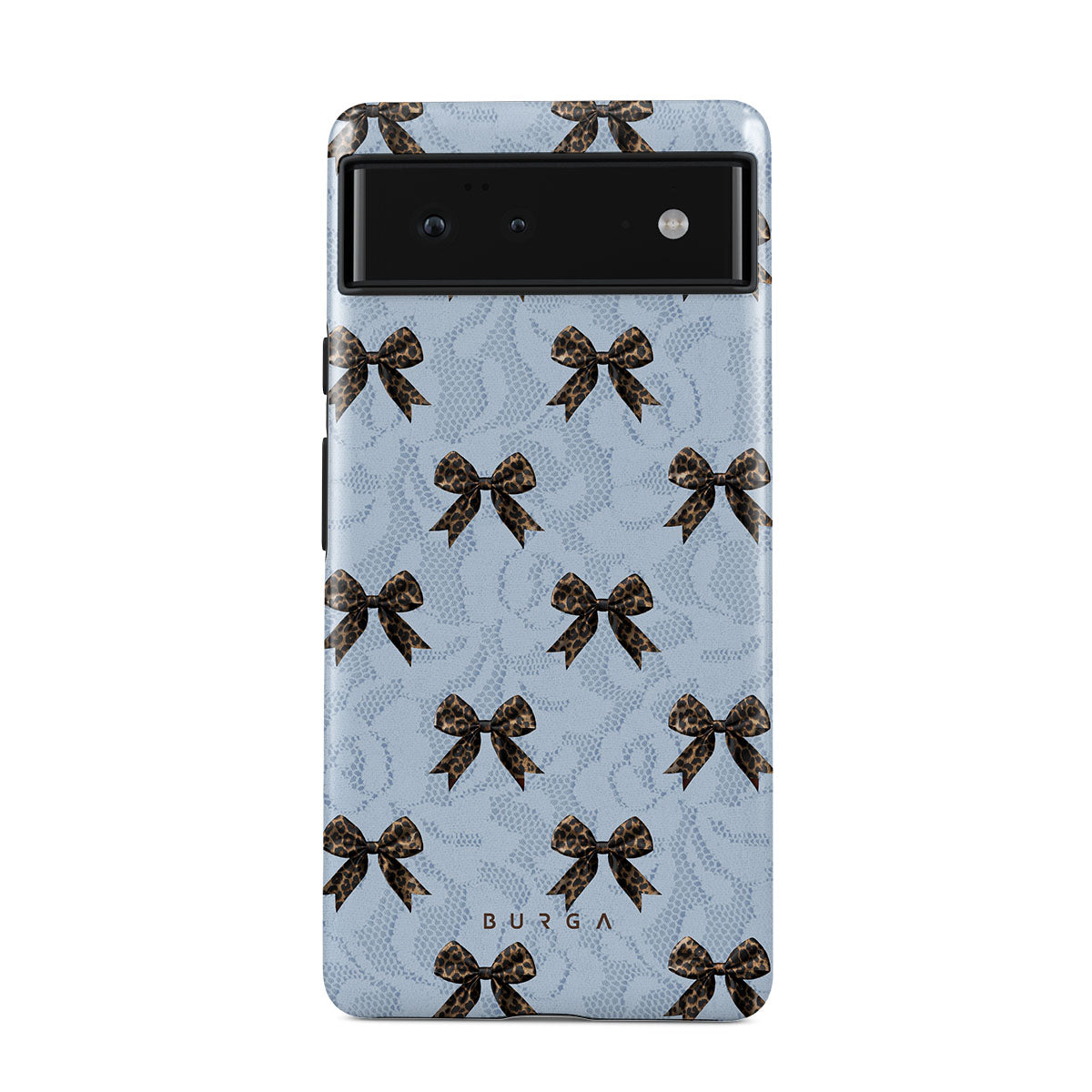 For those who command attention with subtle elegance, our Fashionista Google Pixel 6a phone case design is your go-to. A soft blue background, accented by dark grey bows and subtle lace patterns, exudes polished, effortless style. It's quiet confidence with a hint of charm.