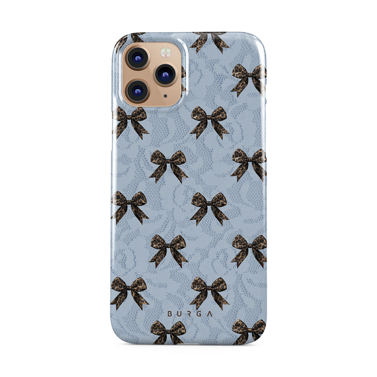 For those who command attention with subtle elegance, our Fashionista iPhone 11 Pro Max phone case design is your go-to. A soft blue background, accented by dark grey bows and subtle lace patterns, exudes polished, effortless style. It's quiet confidence with a hint of charm.