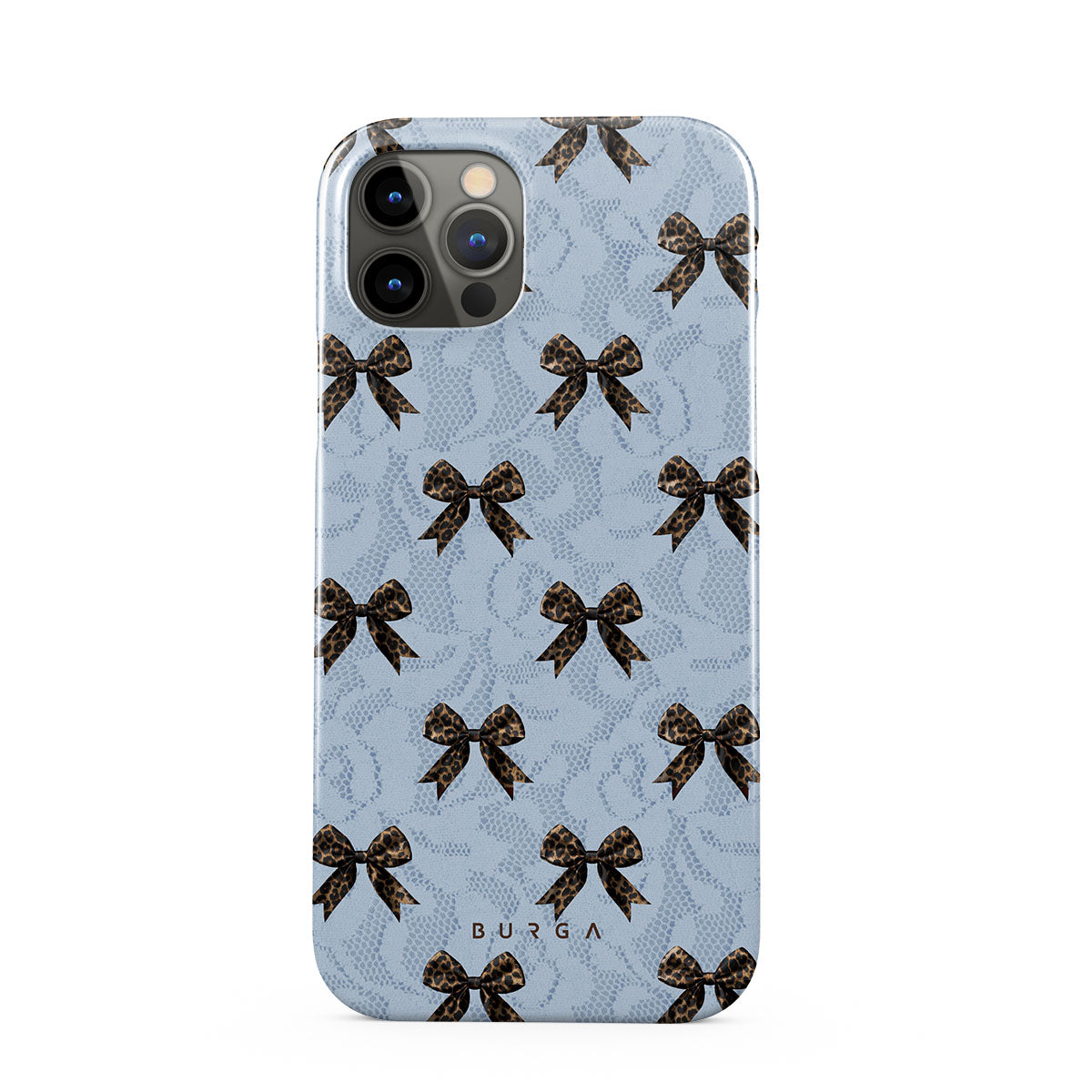 For those who command attention with subtle elegance, our Fashionista iPhone 12 Pro Max phone case design is your go-to. A soft blue background, accented by dark grey bows and subtle lace patterns, exudes polished, effortless style. It's quiet confidence with a hint of charm.