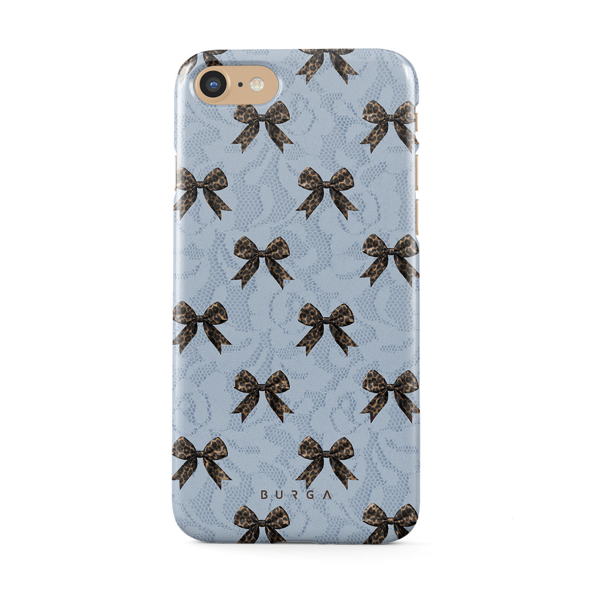 For those who command attention with subtle elegance, our Fashionista iPhone SE (2022) phone case design is your go-to. A soft blue background, accented by dark grey bows and subtle lace patterns, exudes polished, effortless style. It's quiet confidence with a hint of charm.