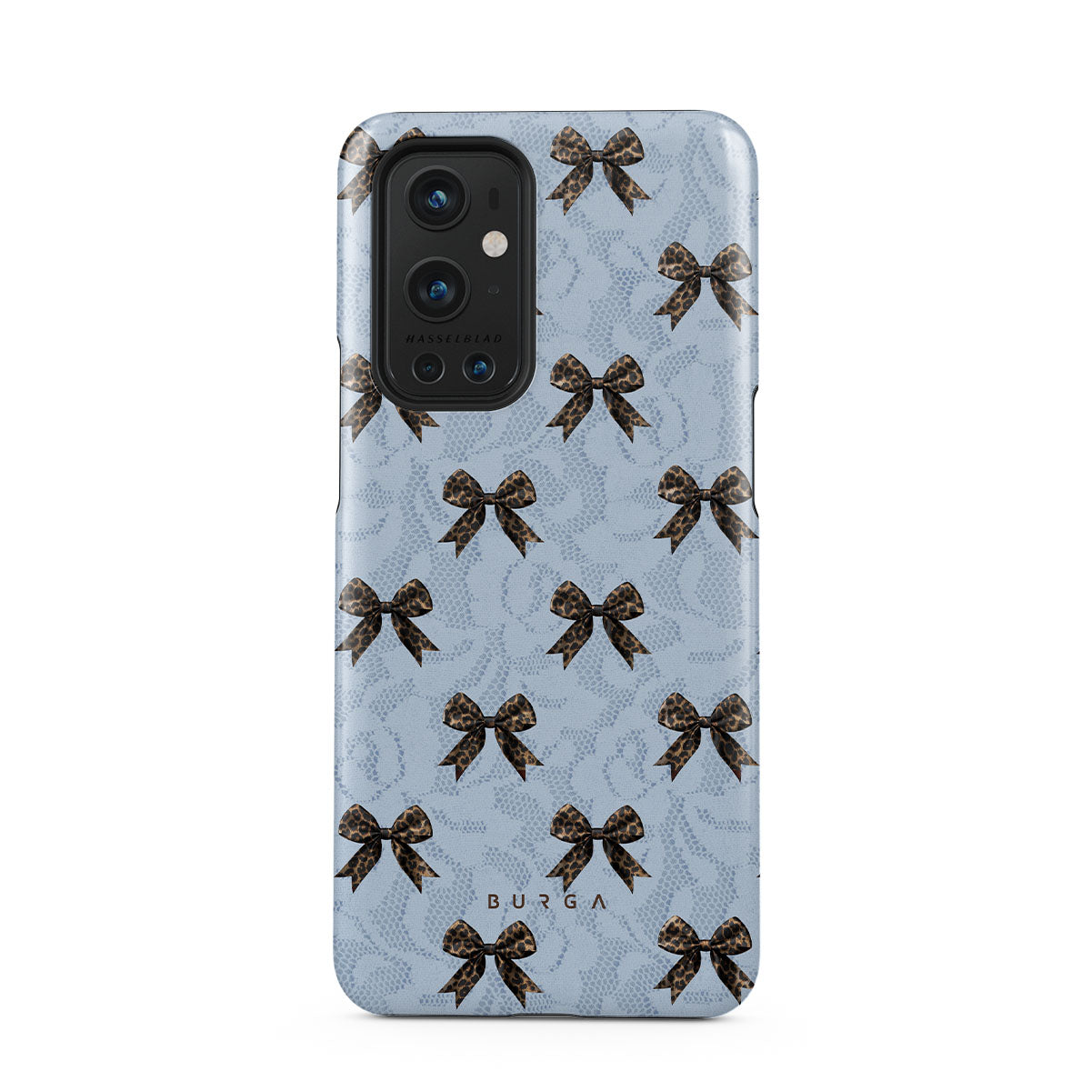 For those who command attention with subtle elegance, our Fashionista OnePlus 9 Pro phone case design is your go-to. A soft blue background, accented by dark grey bows and subtle lace patterns, exudes polished, effortless style. It's quiet confidence with a hint of charm.