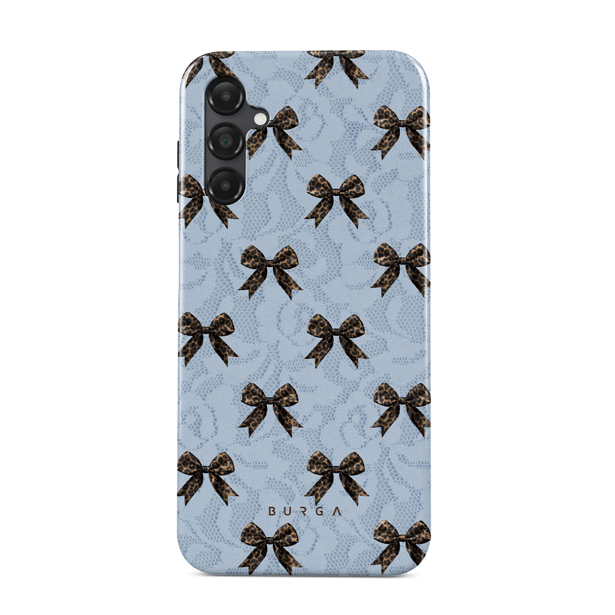 For those who command attention with subtle elegance, our Fashionista Samsung Galaxy A14 5G phone case design is your go-to. A soft blue background, accented by dark grey bows and subtle lace patterns, exudes polished, effortless style. It's quiet confidence with a hint of charm.