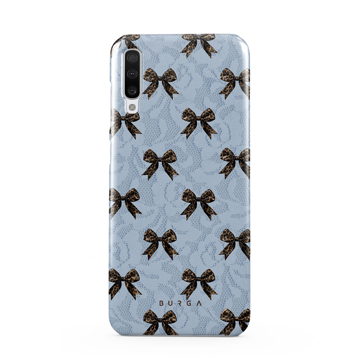 For those who command attention with subtle elegance, our Fashionista Samsung Galaxy A70 phone case design is your go-to. A soft blue background, accented by dark grey bows and subtle lace patterns, exudes polished, effortless style. It's quiet confidence with a hint of charm.