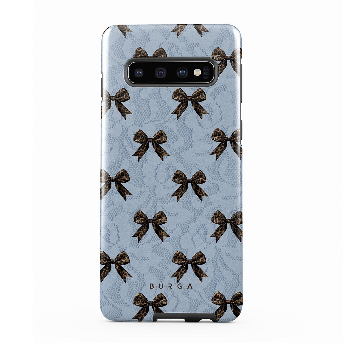 For those who command attention with subtle elegance, our Fashionista Samsung Galaxy S10 4G phone case design is your go-to. A soft blue background, accented by dark grey bows and subtle lace patterns, exudes polished, effortless style. It's quiet confidence with a hint of charm.