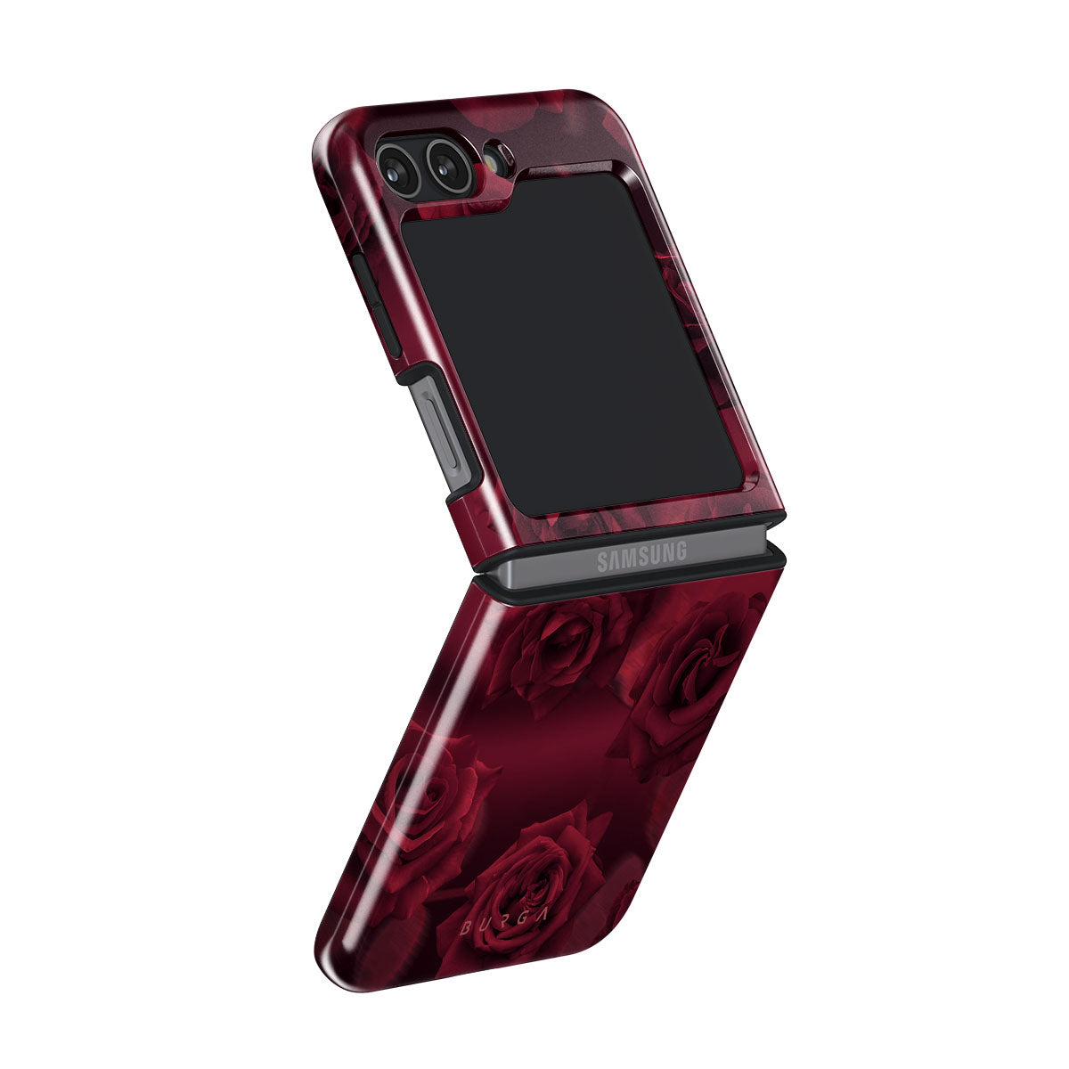 Dive into our intriguing Femme Fatale Samsung Galaxy Z Flip 5 phone case design. These deep red roses aren't just flowers—they're silent confessions of candlelit romance and moments caught in stolen glances. Crafted for those who captivate at every turn.