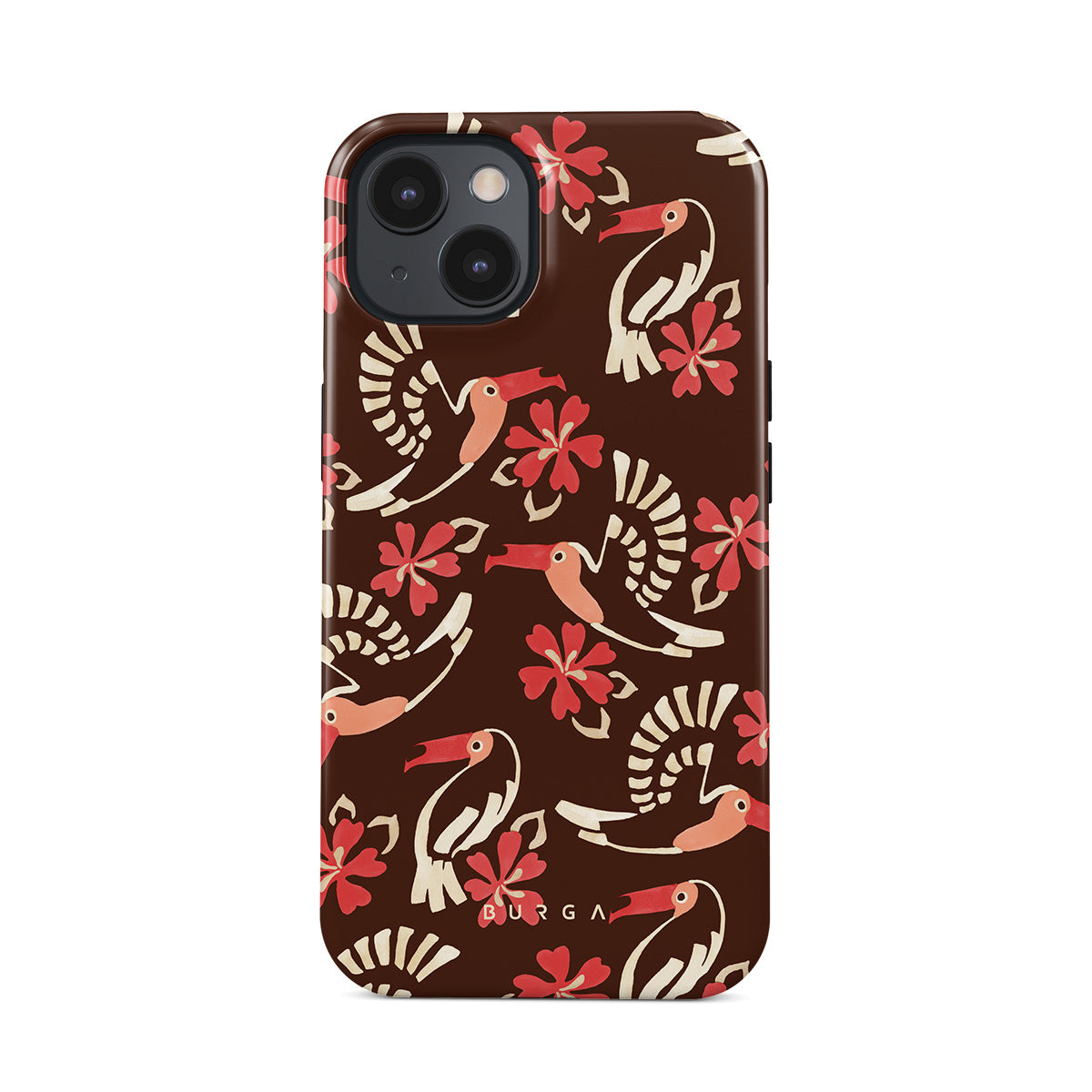 A jungle rave. Parrots, florals, bursts of red and cream—like someone threw a party in the rainforest and forgot to send you the invite. This iPhone 15 phone case design is your RSVP.