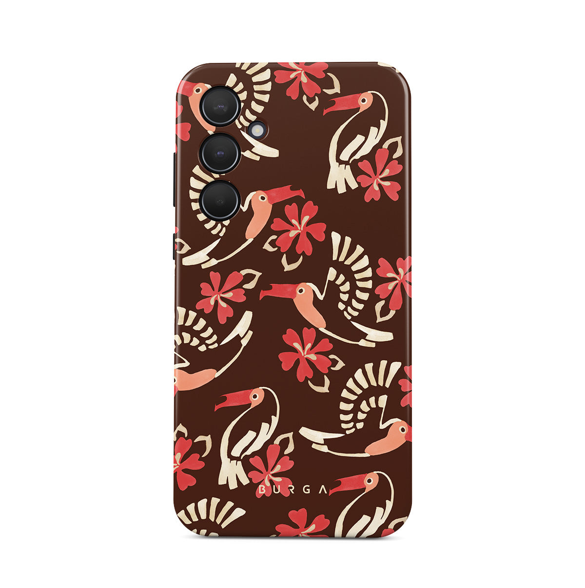 A jungle rave. Parrots, florals, bursts of red and cream—like someone threw a party in the rainforest and forgot to send you the invite. This Samsung Galaxy A35 phone case design is your RSVP.