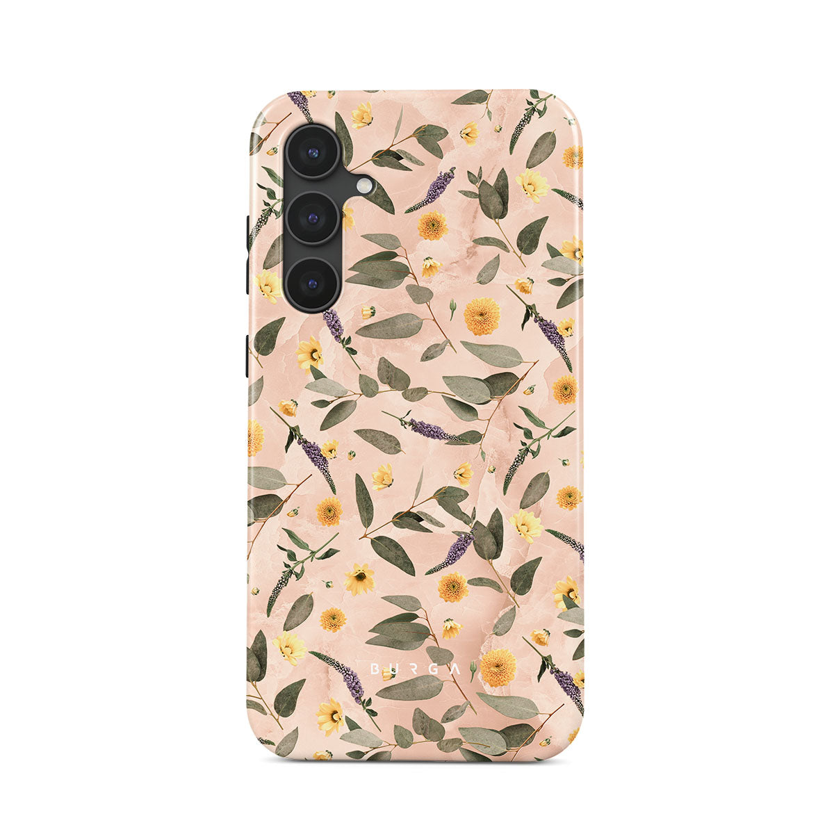 Sunday Brunch Samsung Galaxy S23 FE phone case features a timeless flower pattern. The soft-toned case with a pop of lavender and yellow colors will add a splash of energy to your style while protecting your phone from dangerous falls.