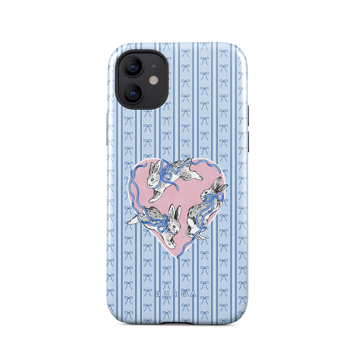 This design features: white rabbits, heart frame, blue stripes