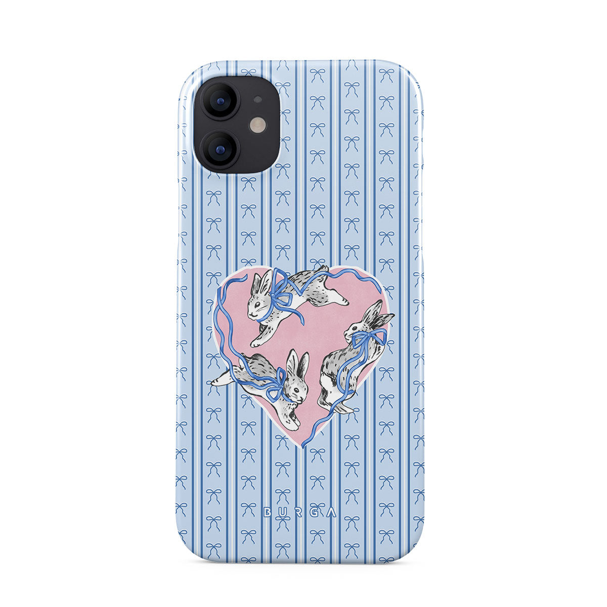 This design features: white rabbits, heart frame, blue stripes