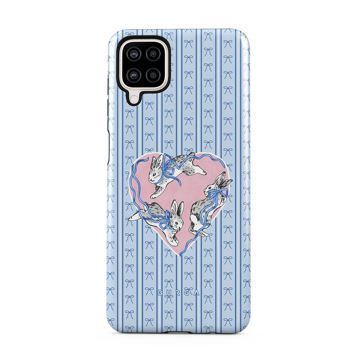 They run, you chase. Or maybe you run, and they chase you. The Follow Me Samsung Galaxy A12 4G phone case design is an eternal loop—white rabbits tangled in pink ribbons, leading you somewhere unknown. Or maybe, somewhere you’ve already been.