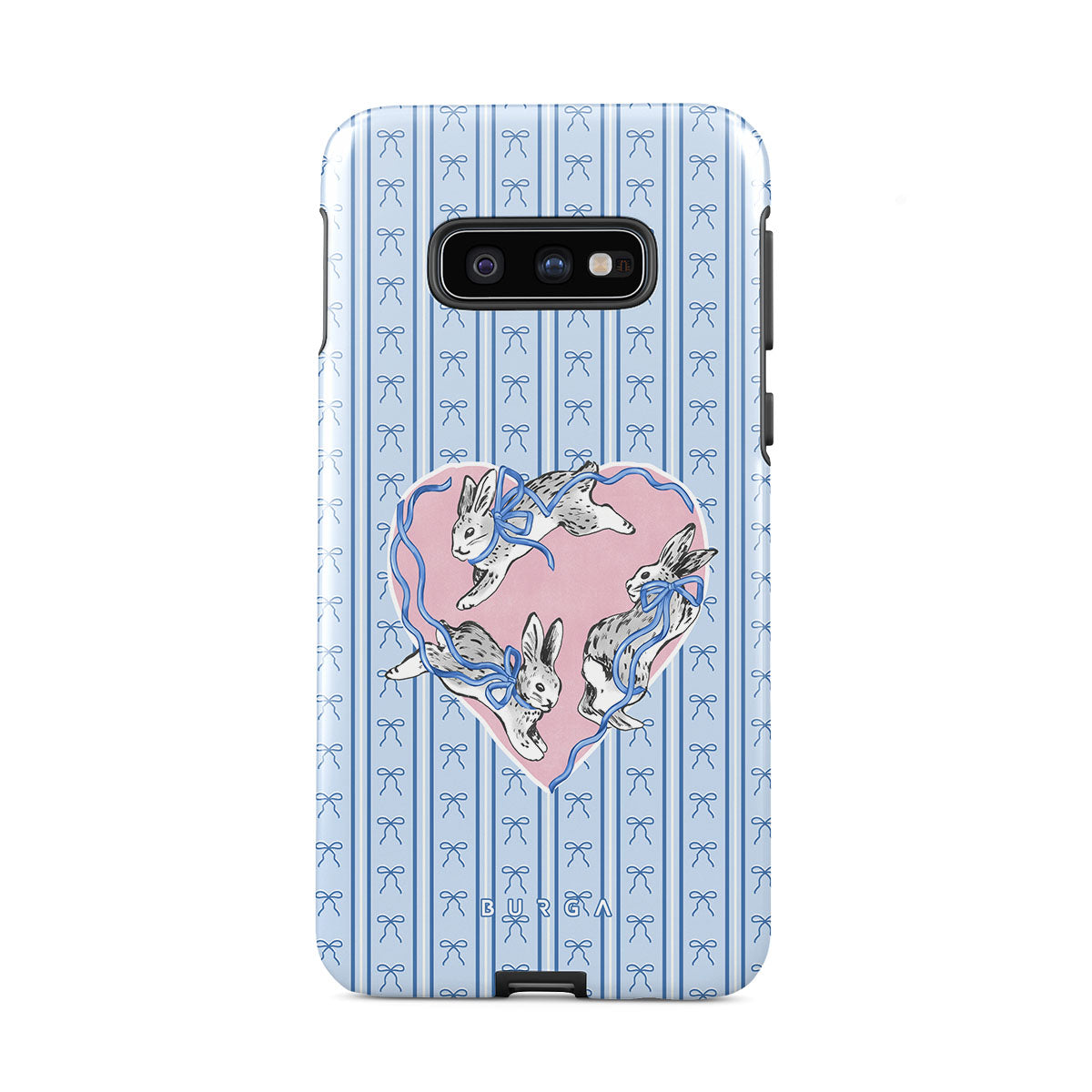 They run, you chase. Or maybe you run, and they chase you. The Follow Me Samsung Galaxy S10E phone case design is an eternal loop—white rabbits tangled in pink ribbons, leading you somewhere unknown. Or maybe, somewhere you’ve already been.