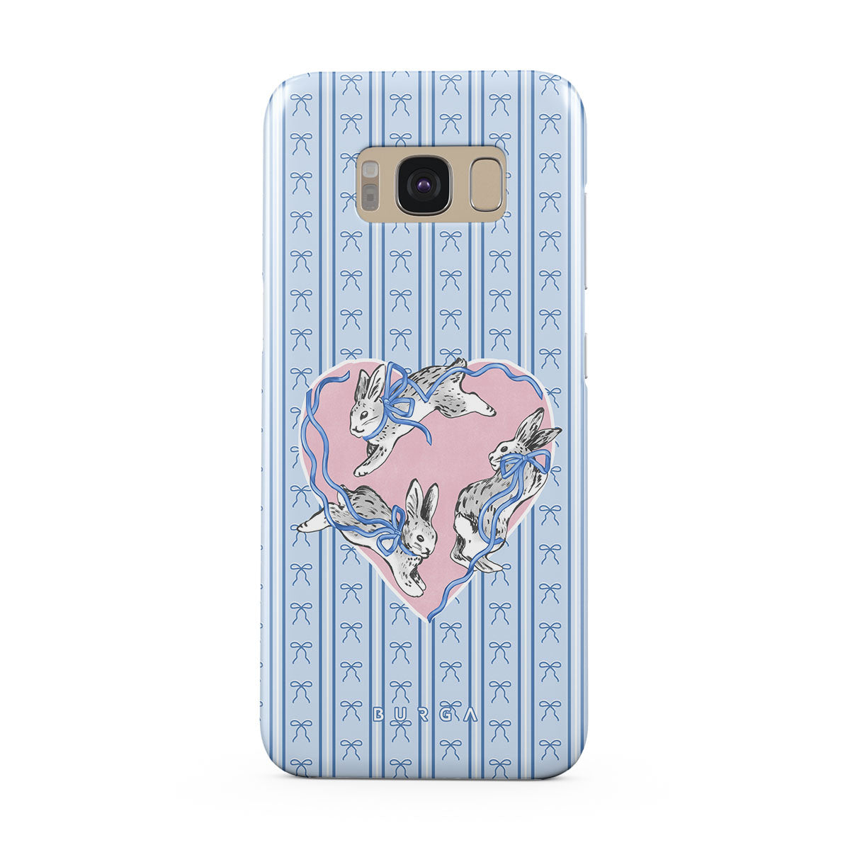 This design features: white rabbits, heart frame, blue stripes