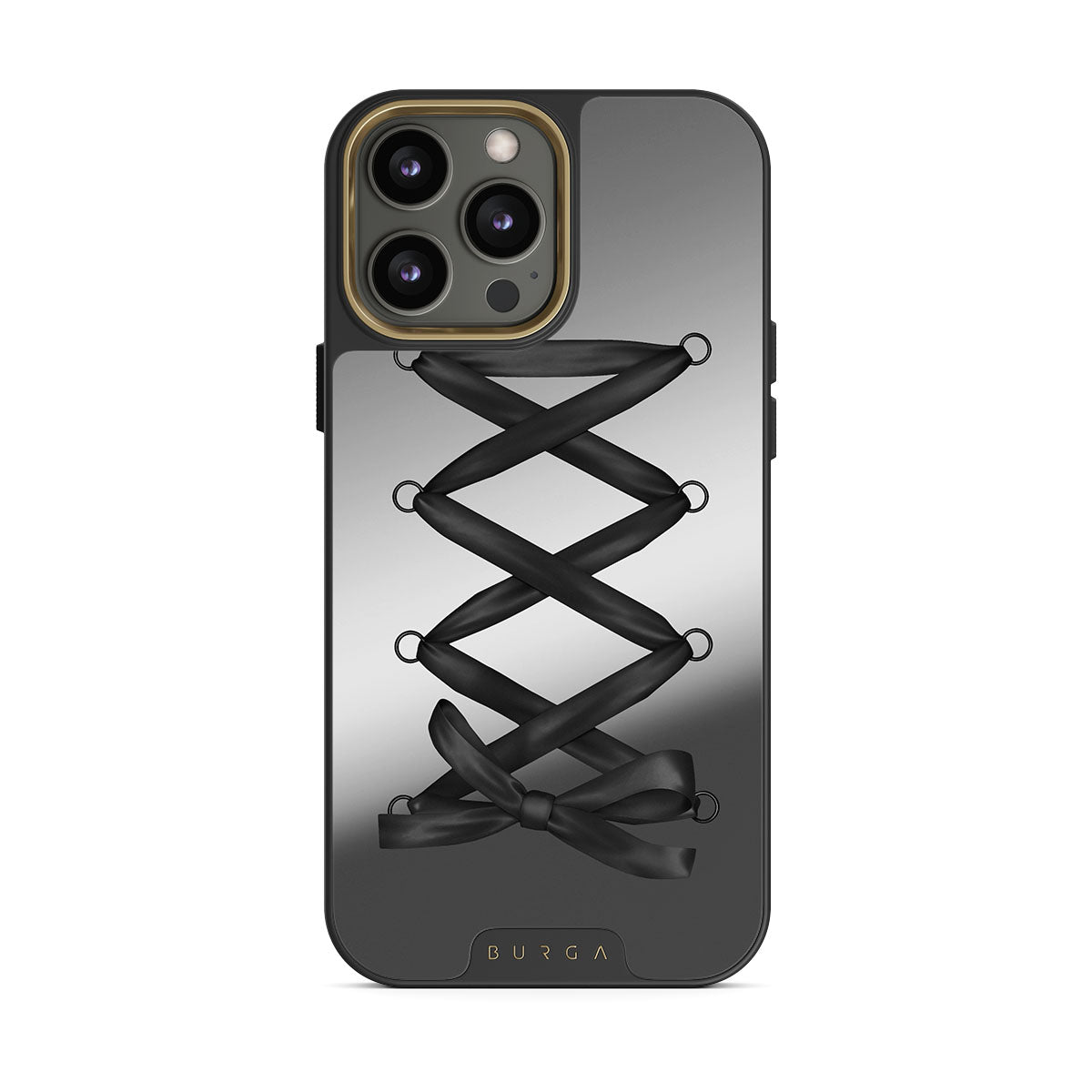 Laced up with sleek black ribbons, this iPhone 13 Pro Max phone case design is all about the art of restraint—and the thrill of breaking it. Forbidden plays with the edge of control, wrapping your desires in layers of mystery. Wear it as a reminder that some rules were made to be broken.
