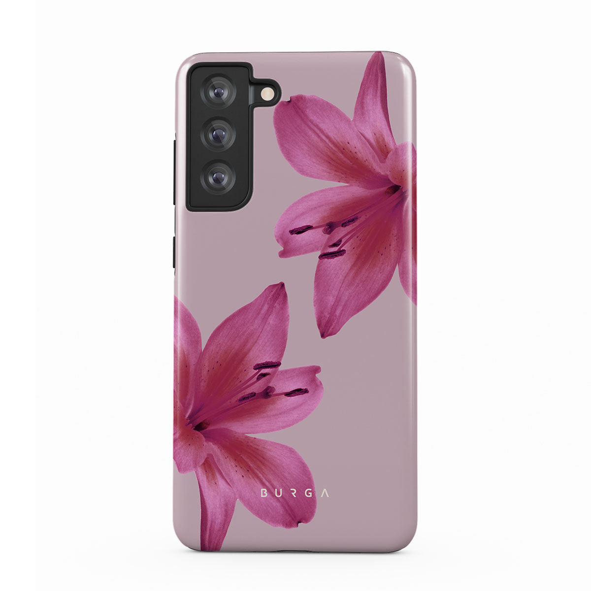 A gentle hush of pink forms where soft lilies sway. Their tender petals — a silent ode to the delicate dance of life. The Fragile Beauty Samsung Galaxy S21 FE phone case design invites you to lean into the soft embrace of nature, letting its subtle rhythms guide your journey.