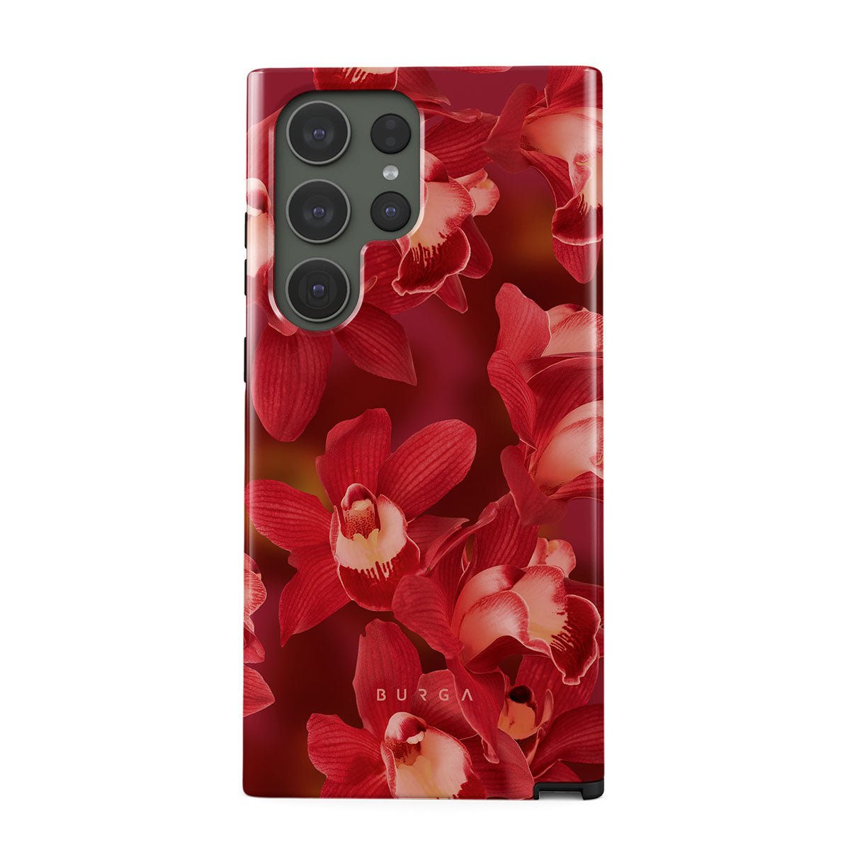 The deep red orchids emerge with a passionate intensity, evoking the fervor and depth of emotions that come with fully experiencing life. They are a vibrant call to embrace every heartbeat, to live deeply and love boldly. Discover the Goddess Energy Samsung Galaxy S23 Ultra phone case design.