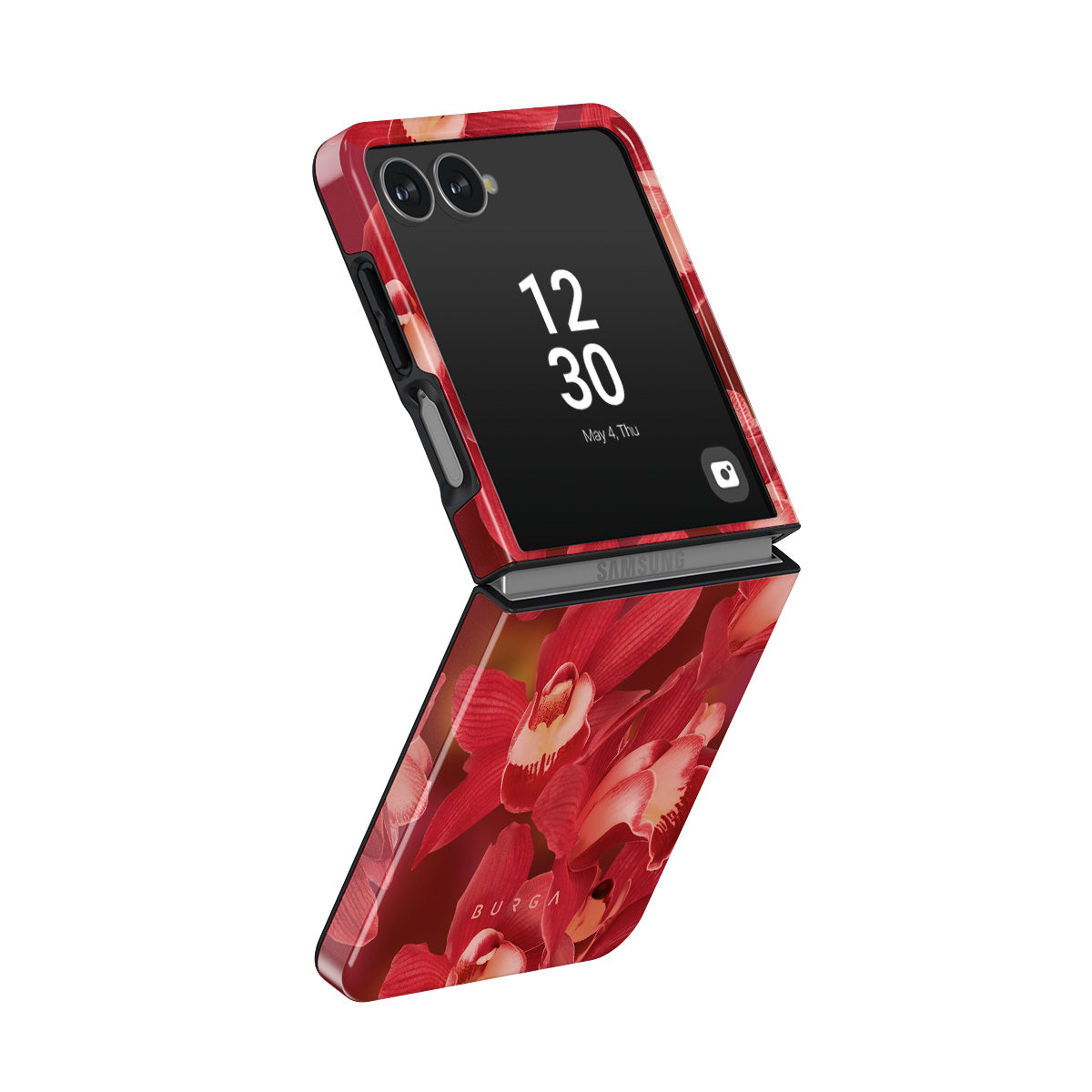 The deep red orchids emerge with a passionate intensity, evoking the fervor and depth of emotions that come with fully experiencing life. They are a vibrant call to embrace every heartbeat, to live deeply and love boldly. Discover the Goddess Energy Samsung Galaxy Z Flip 7 phone case design.