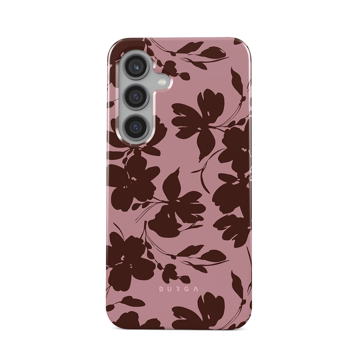 Quietly bold, our Gossip Samsung Galaxy S24 FE phone case design speaks volumes in subtlety. A soft rosé background, layered with deep red-brown floral accents, gives off a refined, almost mysterious vibe. It's for those who let the details do the talking.