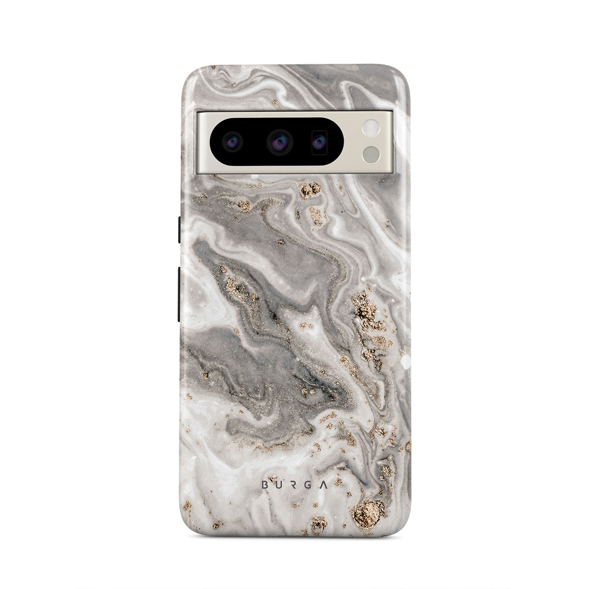 The wind outside is playing his songs. Some fear, some love, and some simply enjoy. But do not be afraid, with our grey marble Google Pixel 8 Pro phone case inspired by a beautiful snowstorm, you can have the pretty part of it without any coldness. And as the case offers heavy-duty protection, your phone will also be safe and sound!