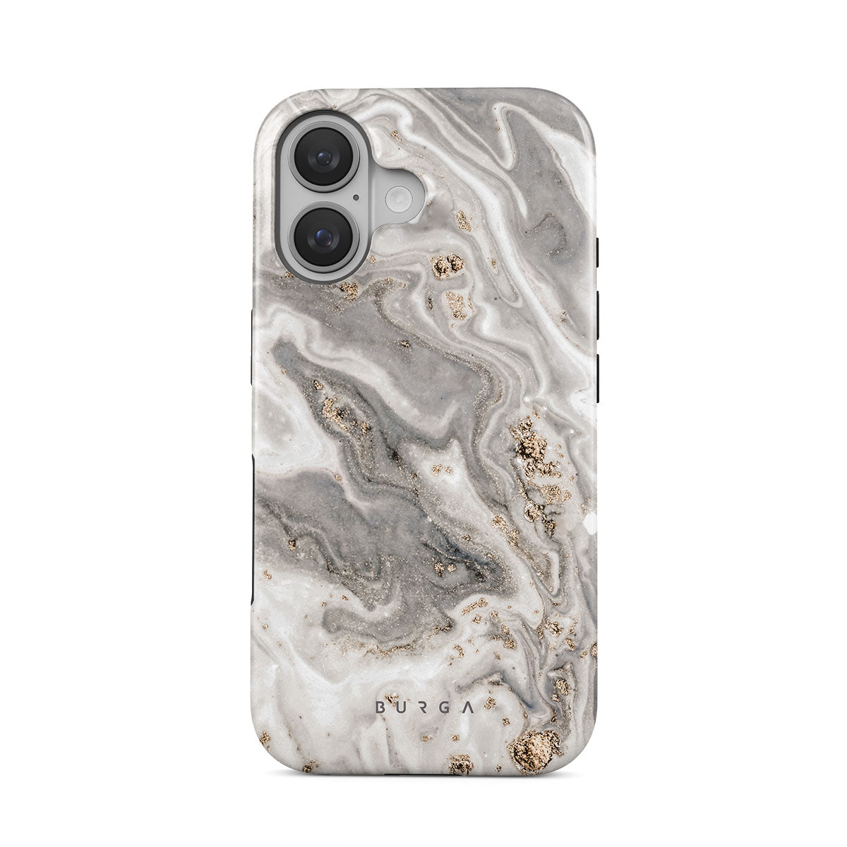 The wind outside is playing his songs. Some fear, some love, and some simply enjoy. But do not be afraid, with our grey marble iPhone 16 Plus phone case inspired by a beautiful snowstorm, you can have the pretty part of it without any coldness. And as the case offers heavy-duty protection, your phone will also be safe and sound!