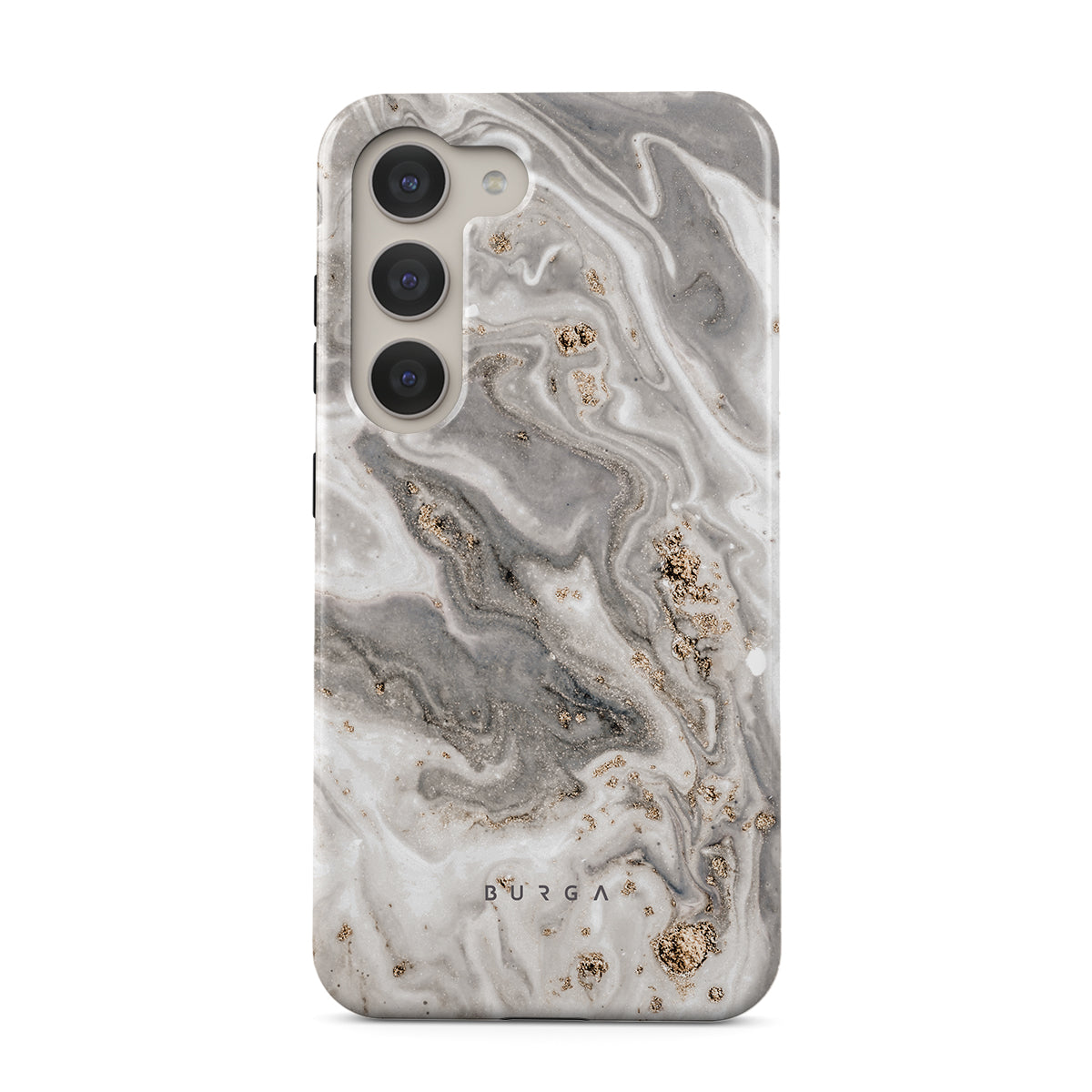 The wind outside is playing his songs. Some fear, some love, and some simply enjoy. But do not be afraid, with our grey marble Samsung Galaxy S23 phone case inspired by a beautiful snowstorm, you can have the pretty part of it without any coldness. And as the case offers heavy-duty protection, your phone will also be safe and sound!