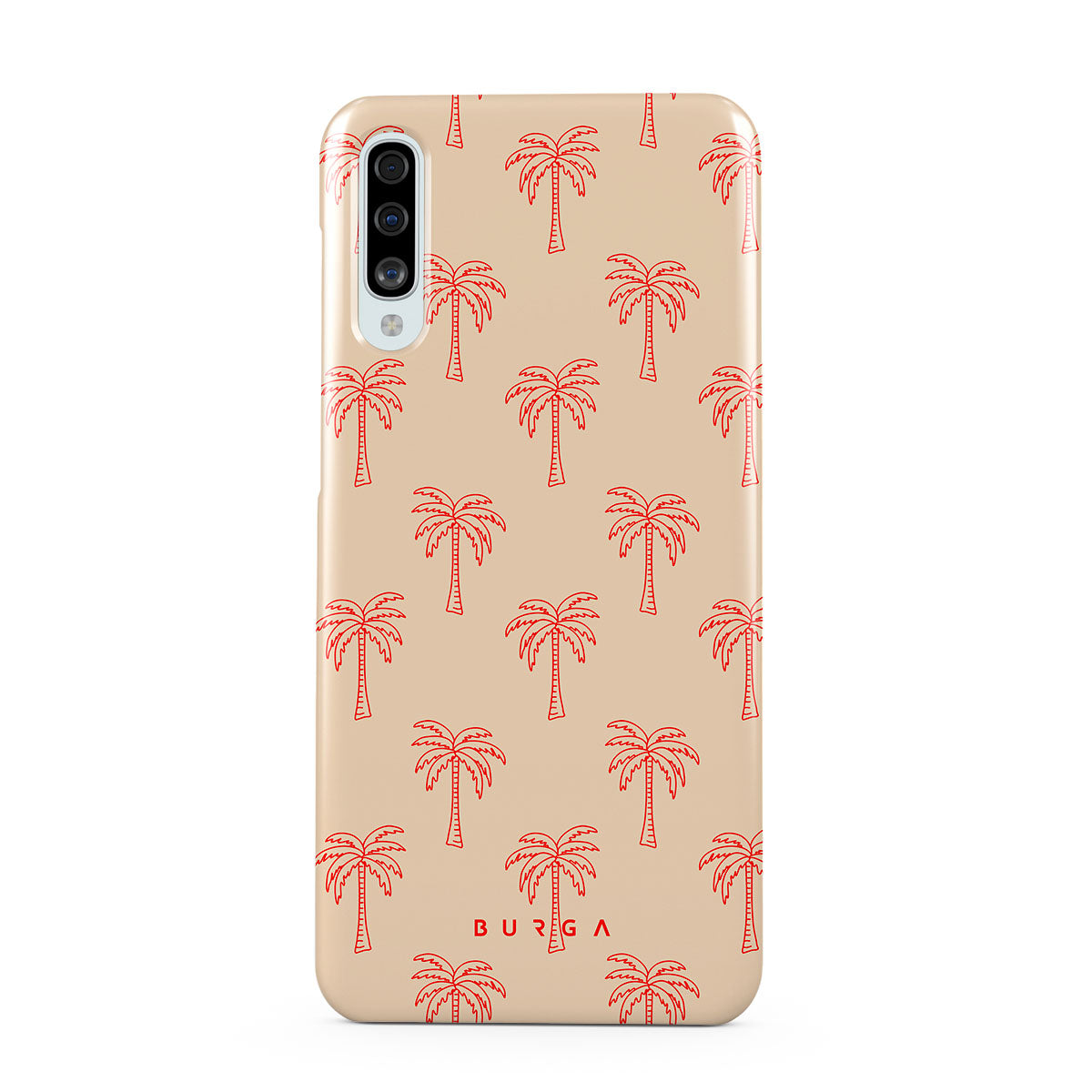 Retreat into the serene whispers of our Happy Hour design. Gentle pink palms sway on a soothing blush background, creating images of a tranquil paradise. This Samsung Galaxy A50 phone case is perfect for dreamers and nature lovers who seek a daily escape into tranquility.