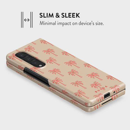 Retreat into the serene whispers of our Happy Hour design. Gentle pink palms sway on a soothing blush background, creating images of a tranquil paradise. This Samsung Galaxy Z Fold 4 phone case is perfect for dreamers and nature lovers who seek a daily escape into tranquility.