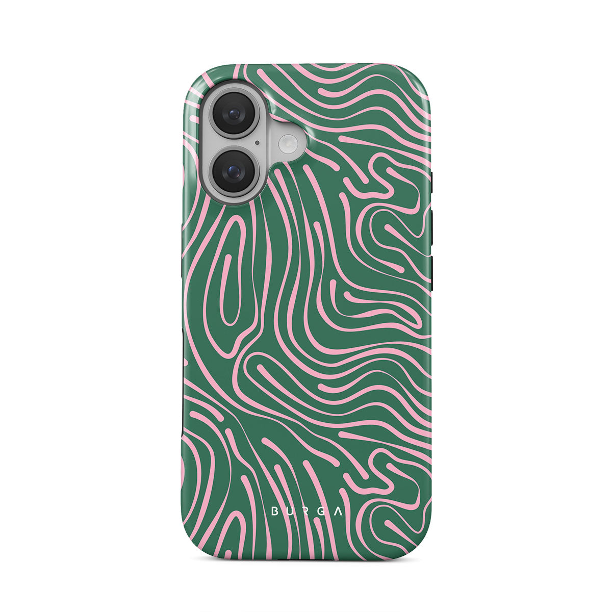 Fresh and mesmerizing, our Hawaiian Breeze iPhone 16 Plus phone case design combines a pastel pink wavy pattern with a crisp green background creating a refreshing look. The abstract pattern will indeed become a star in your accessorizing game, while the phone case will keep your device protected at all times!