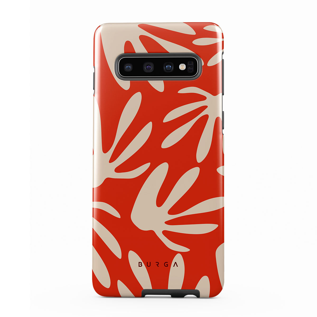 Unfolding the untamed allure of a summer sunset, this design boasts a vivid red background that sets your spirit of adventure aflame. Sprinkled across this fierce backdrop, lines of radiance dance playfully. Experience the warmth of passion and the sparkle of joy in the palm of your hand with our Heatwave Samsung Galaxy S10 4G phone case.