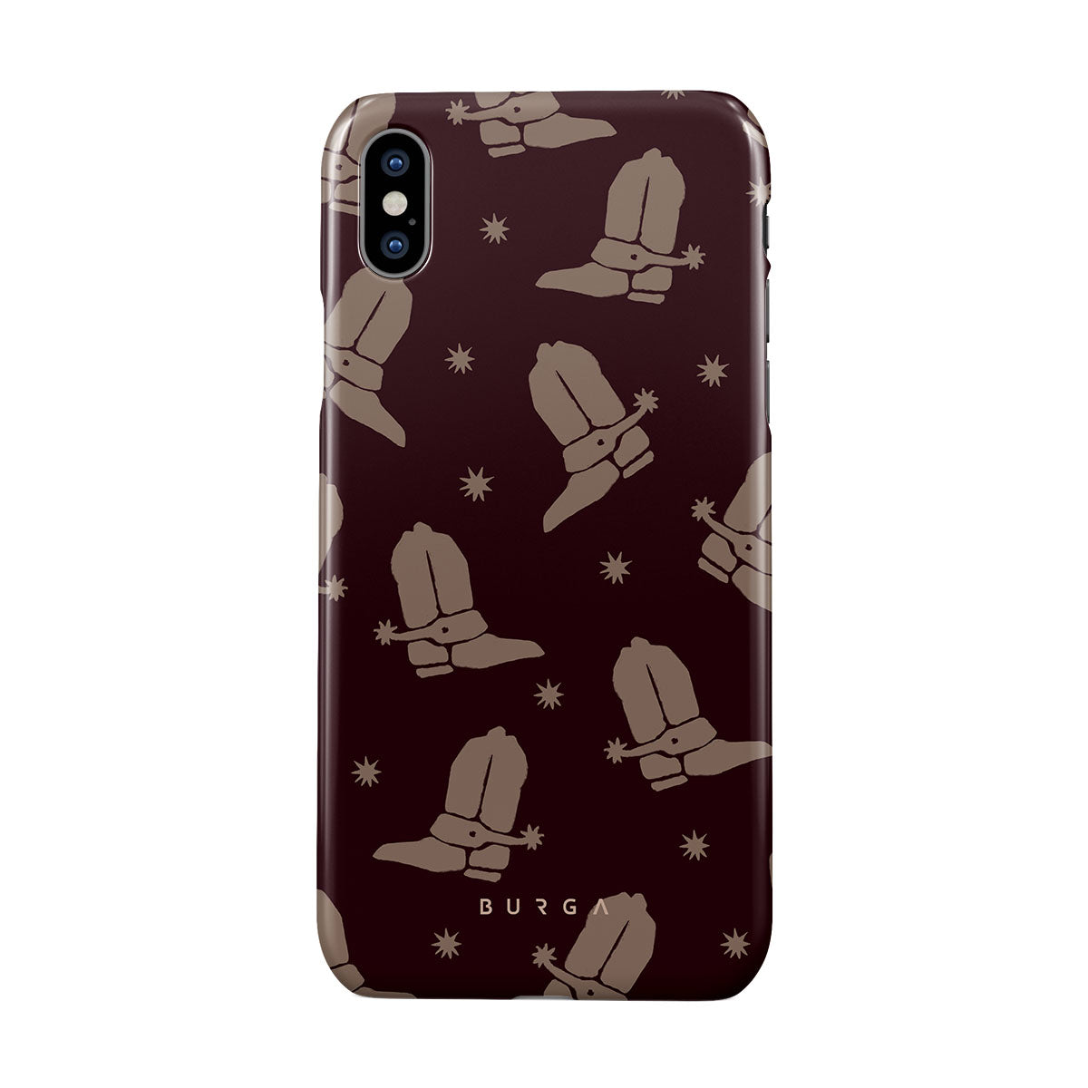 Say Howdy to this charming iPhone X / XS phone case design. Cowboy boots and stars dance across a deep brown background, celebrating the essence of western life. Perfect for those who embrace their free spirit.