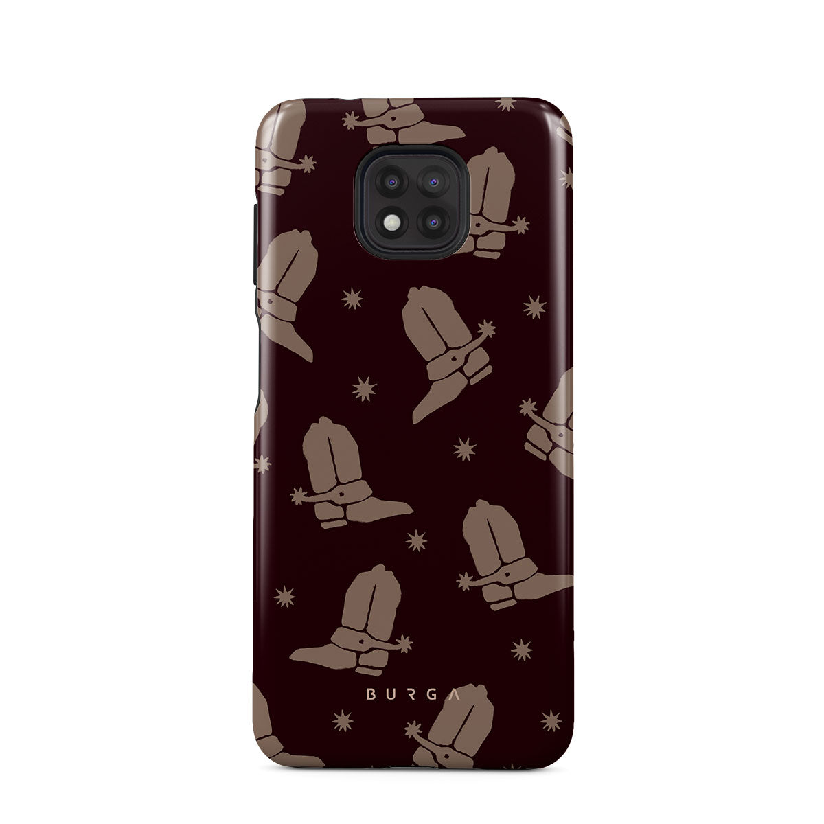 Say Howdy to this charming Motorola Moto G Power 2021 phone case design. Cowboy boots and stars dance across a deep brown background, celebrating the essence of western life. Perfect for those who embrace their free spirit.