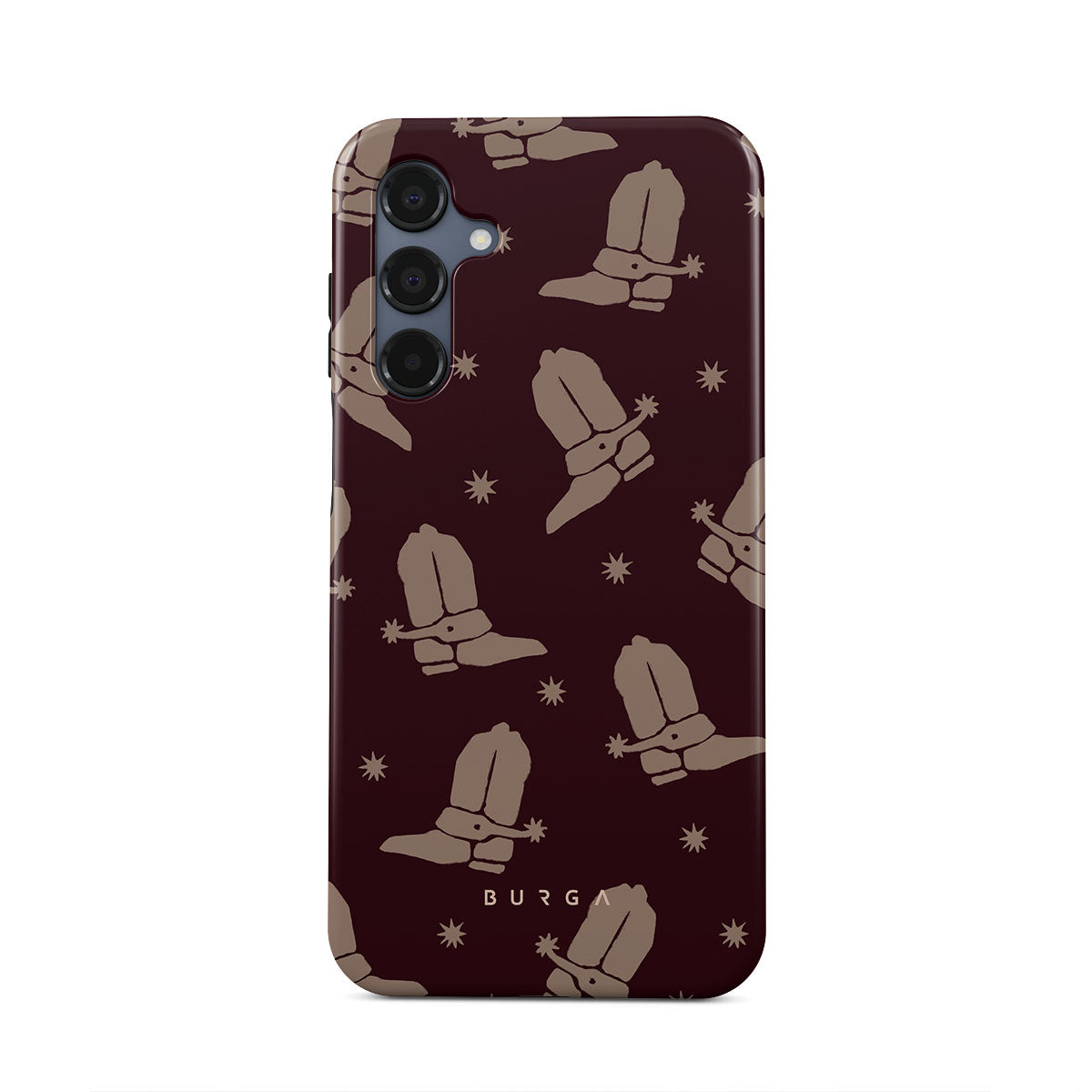 Say Howdy to this charming Samsung Galaxy A16 phone case design. Cowboy boots and stars dance across a deep brown background, celebrating the essence of western life. Perfect for those who embrace their free spirit.