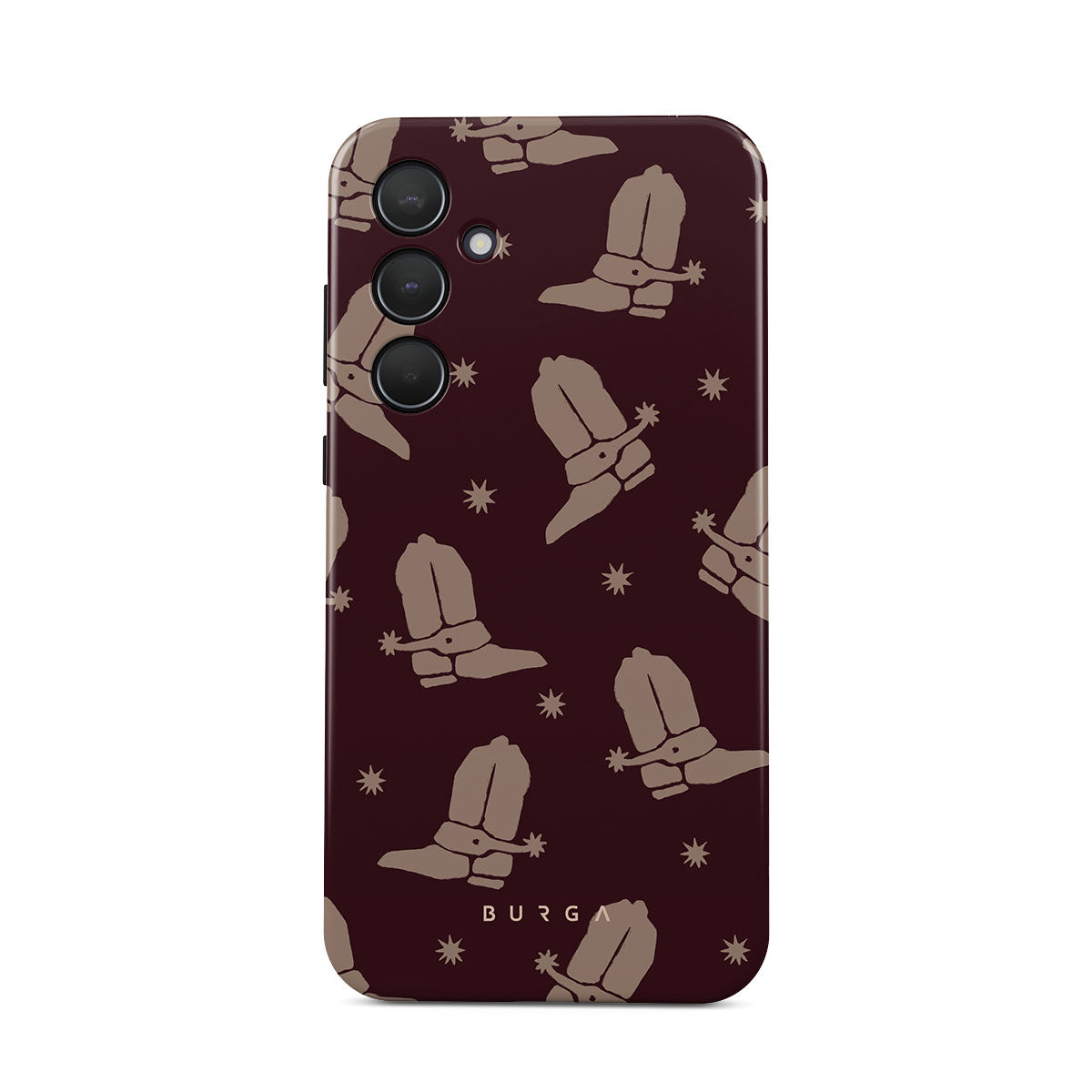 Say Howdy to this charming Samsung Galaxy A35 phone case design. Cowboy boots and stars dance across a deep brown background, celebrating the essence of western life. Perfect for those who embrace their free spirit.