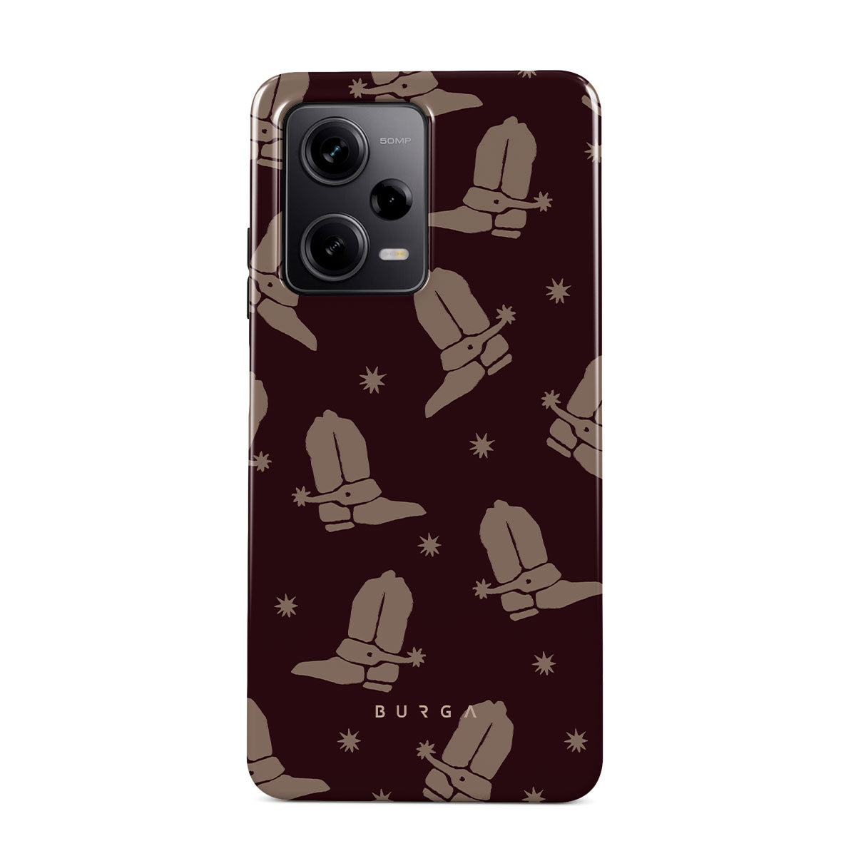 Say Howdy to this charming Xiaomi Redmi Note 12 Pro+ 5G phone case design. Cowboy boots and stars dance across a deep brown background, celebrating the essence of western life. Perfect for those who embrace their free spirit.