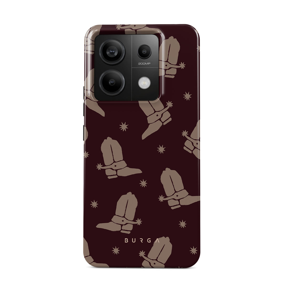 Say Howdy to this charming Xiaomi Redmi Note 13 Pro 5G phone case design. Cowboy boots and stars dance across a deep brown background, celebrating the essence of western life. Perfect for those who embrace their free spirit.