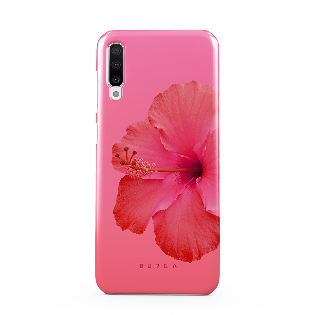 Our Island Girl Samsung Galaxy A70 phone case design bursts with the fiery red of a hibiscus in full bloom against a dreamy pink backdrop. Perfect for those who embody the spirit of a sun-kissed island retreat.
