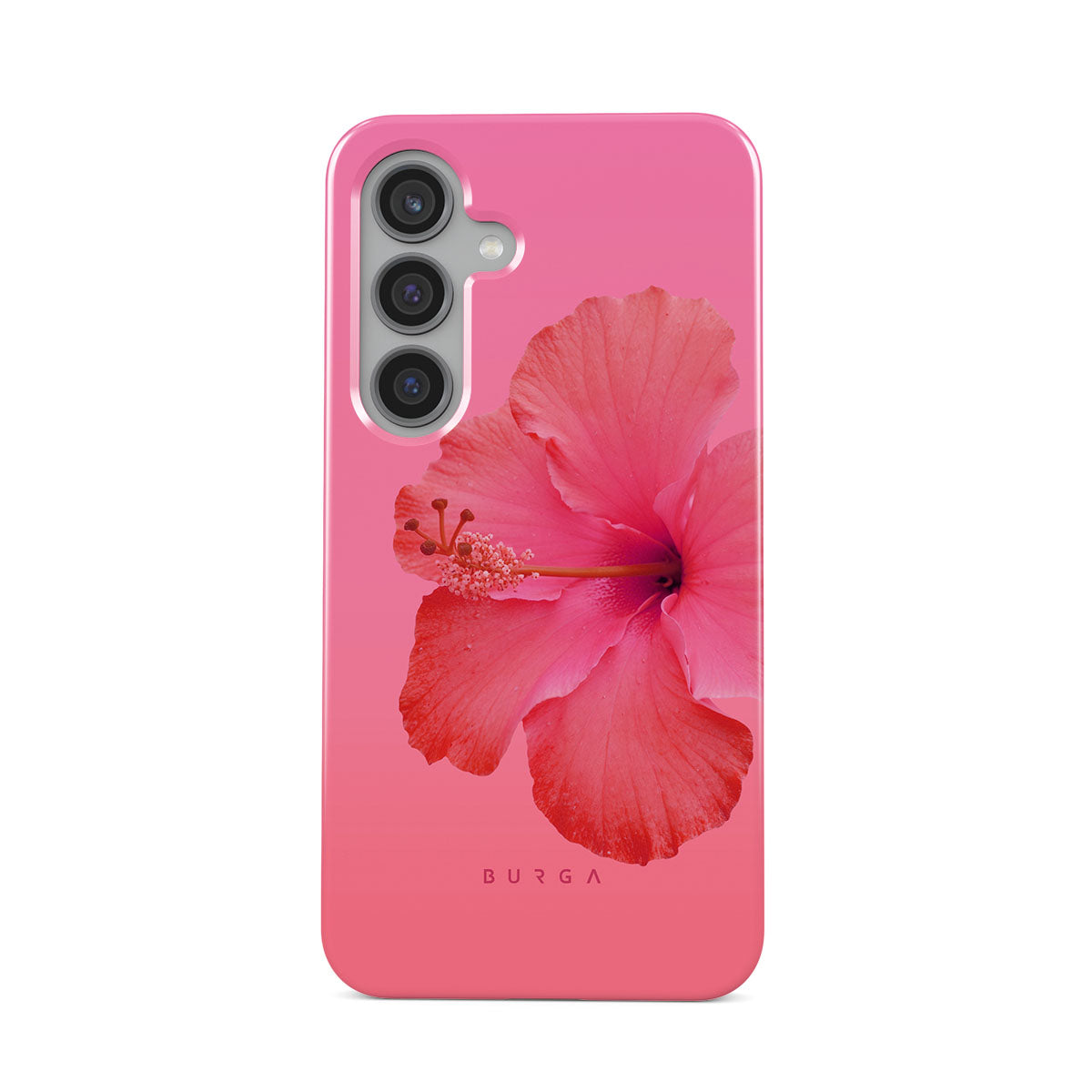 Our Island Girl Samsung Galaxy S24 FE phone case design bursts with the fiery red of a hibiscus in full bloom against a dreamy pink backdrop. Perfect for those who embody the spirit of a sun-kissed island retreat.