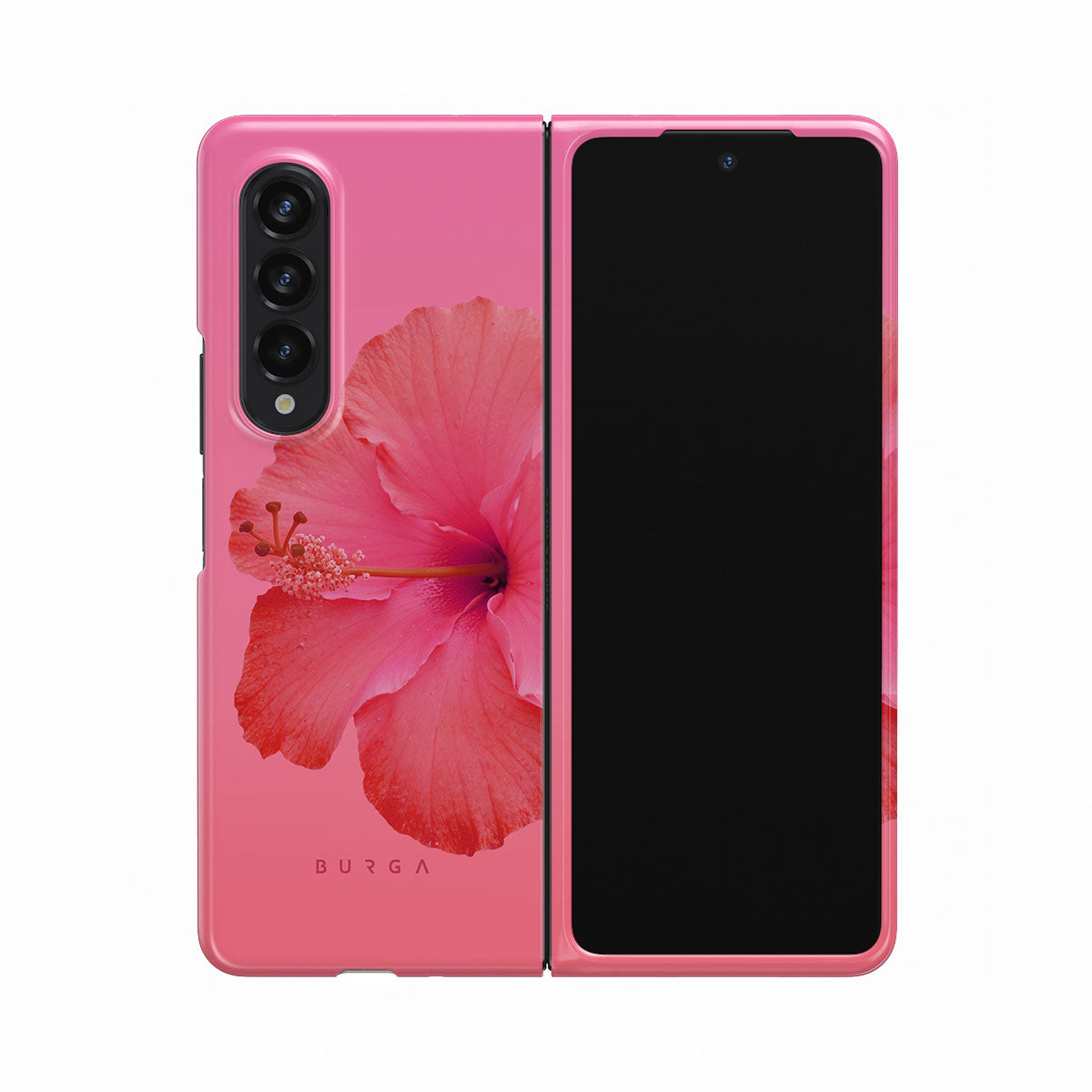 Our Island Girl Samsung Galaxy Z Fold 3 phone case design bursts with the fiery red of a hibiscus in full bloom against a dreamy pink backdrop. Perfect for those who embody the spirit of a sun-kissed island retreat.