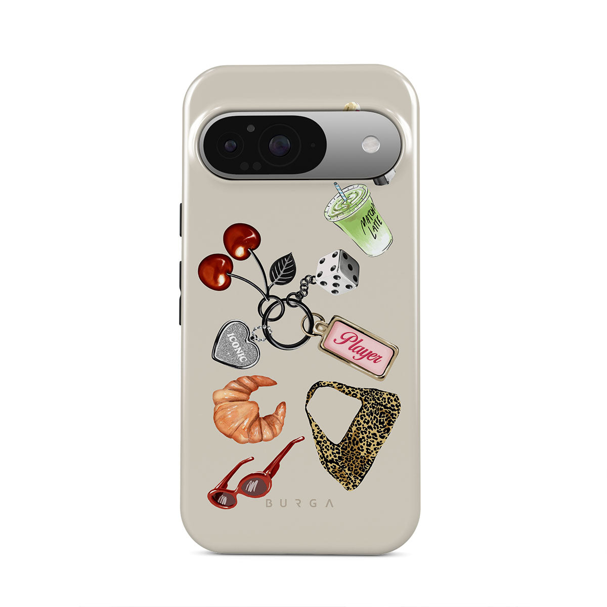 This design features: red sunglasses, red lipstick, green matcha drink, croissant, black dice, leopard-print bag, keychain with silver heart, cherries, dice and "Player" tag