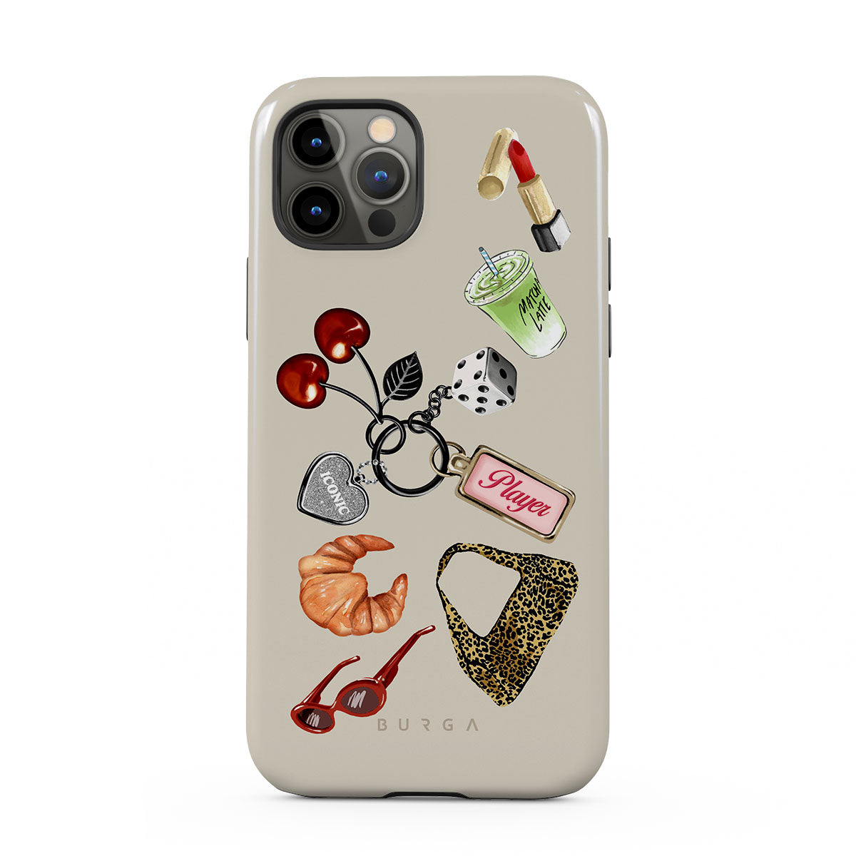 This design features: red sunglasses, red lipstick, green matcha drink, croissant, black dice, leopard-print bag, keychain with silver heart, cherries, dice and "Player" tag