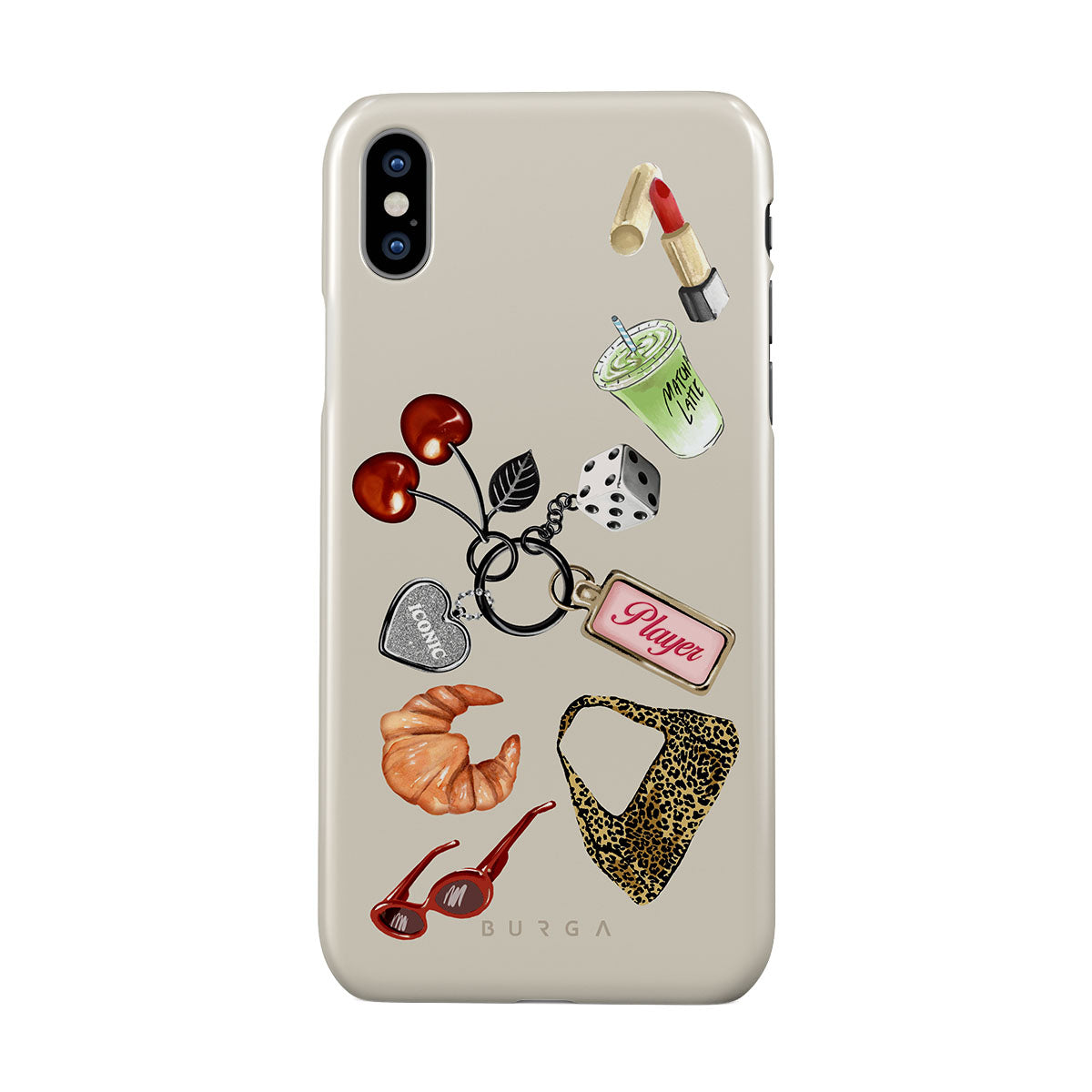 This design features: red sunglasses, red lipstick, green matcha drink, croissant, black dice, leopard-print bag, keychain with silver heart, cherries, dice and "Player" tag