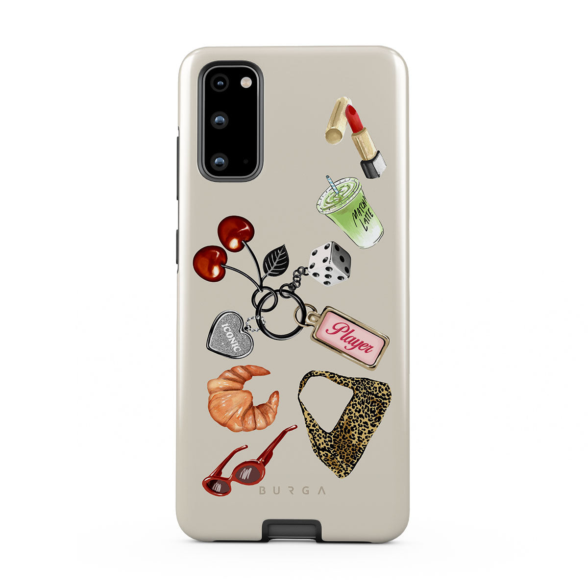 This design features: red sunglasses, red lipstick, green matcha drink, croissant, black dice, leopard-print bag, keychain with silver heart, cherries, dice and "Player" tag