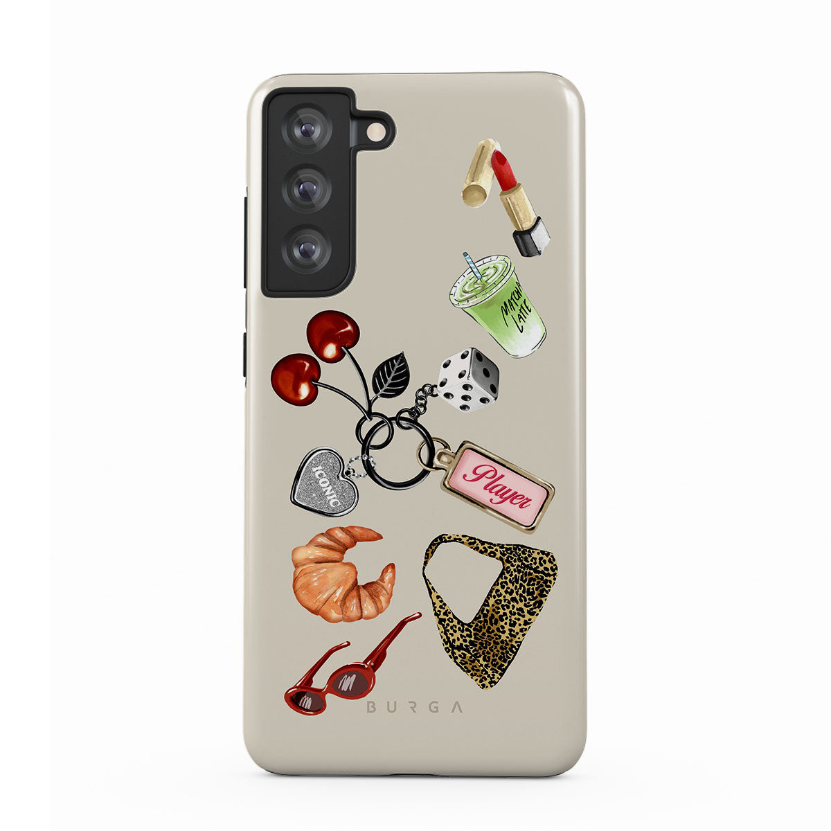 This design features: red sunglasses, red lipstick, green matcha drink, croissant, black dice, leopard-print bag, keychain with silver heart, cherries, dice and "Player" tag