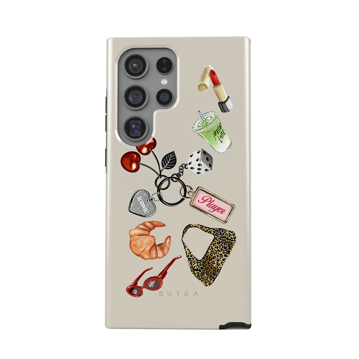 This design features: red sunglasses, red lipstick, green matcha drink, croissant, black dice, leopard-print bag, keychain with silver heart, cherries, dice and "Player" tag