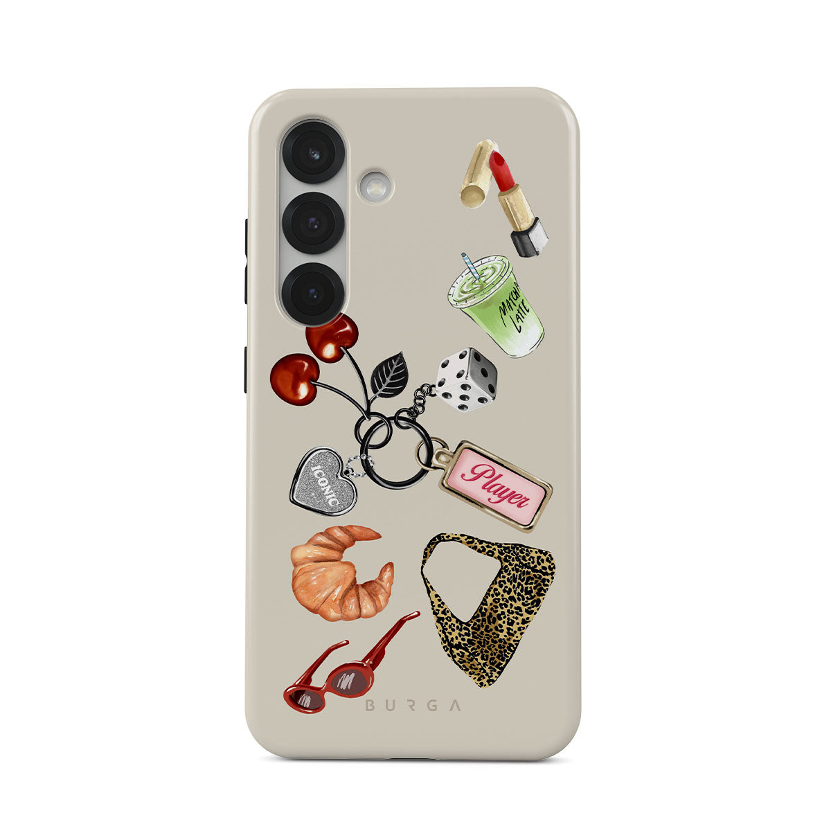 This design features: red sunglasses, red lipstick, green matcha drink, croissant, black dice, leopard-print bag, keychain with silver heart, cherries, dice and "Player" tag