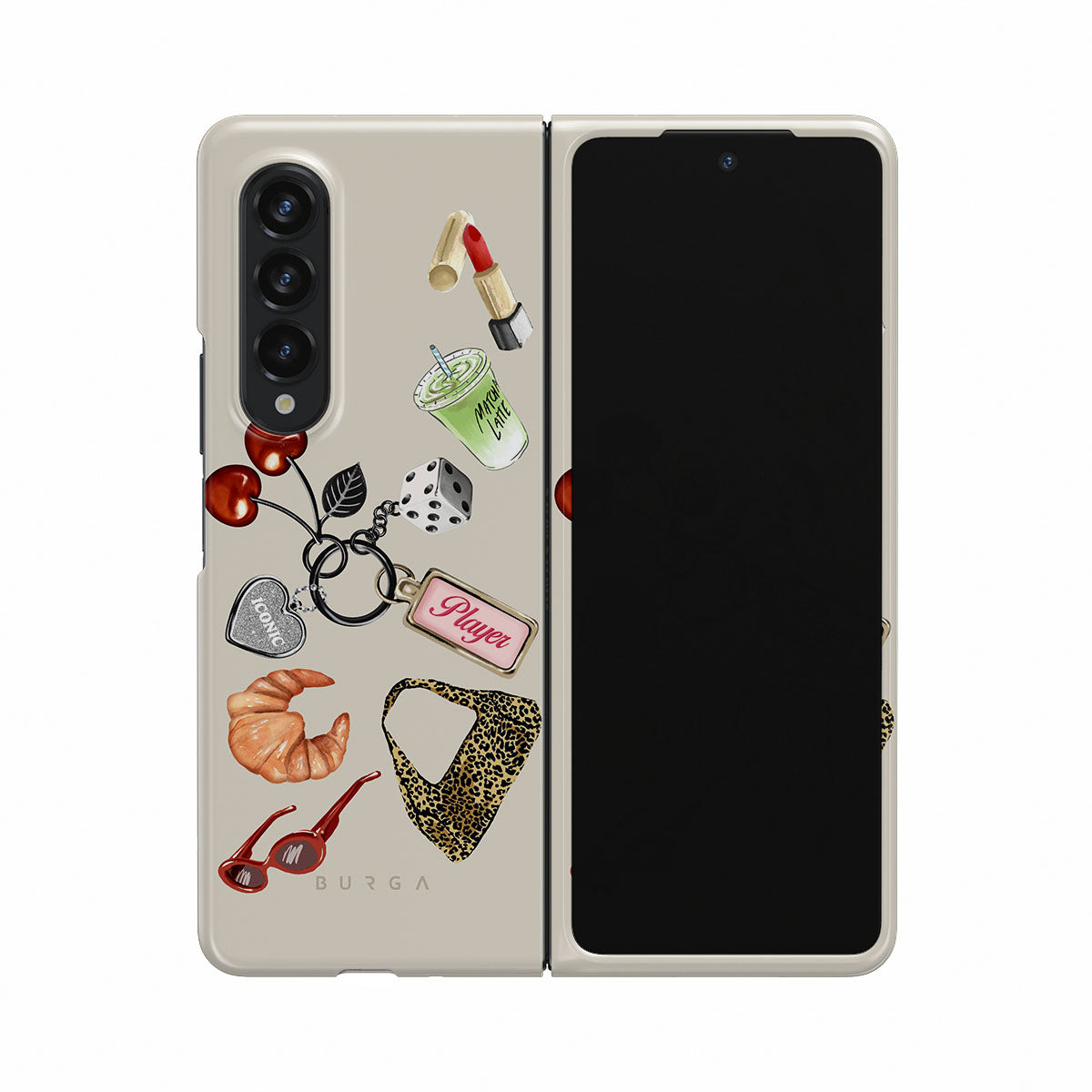 This design features: red sunglasses, red lipstick, green matcha drink, croissant, black dice, leopard-print bag, keychain with silver heart, cherries, dice and "Player" tag