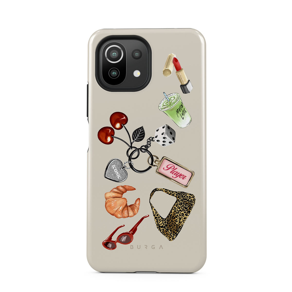 This design features: red sunglasses, red lipstick, green matcha drink, croissant, black dice, leopard-print bag, keychain with silver heart, cherries, dice and "Player" tag